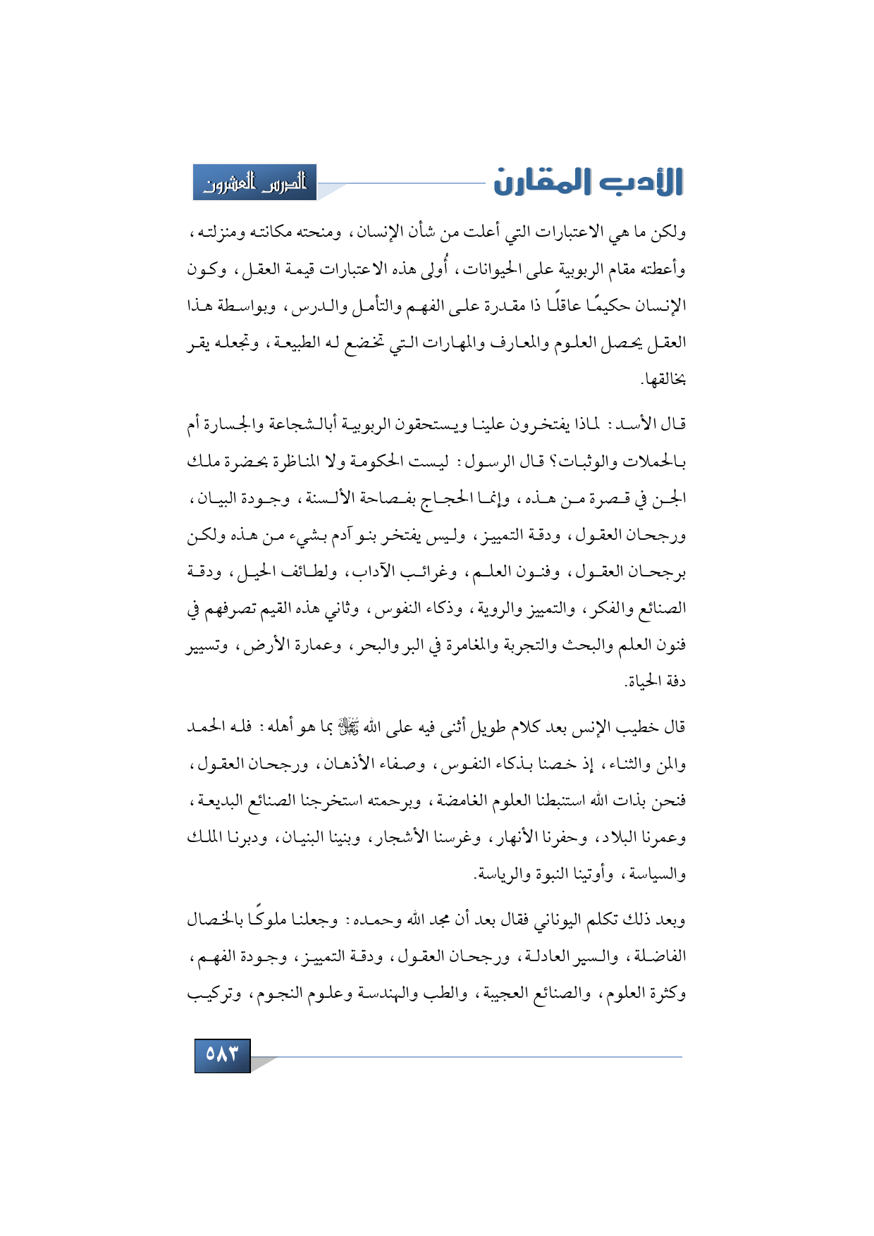 قال الأسد: لماذا يفتخرون علينا ويستحقون الربوبية أم بالشجاعة والجسارة أما بالحملات والوثبات؟ قال الرسول: ليست الحكومة ولا المناظرة بحضرة ملك الجن في قصرة من هذه، وإنما الحجاج بفصاحة الألسنة، وجودة البيان، ورجحان العقول، ودقة التمييز، وليس يفتخر بنو آدم بشيء من هذه ولكن برجحان العقول، وفنون العلم، وغرائب الآداب، ولطائف الحيل، ودقة الصنائع والفكر، والتمييز والروية، وذكاء النفوس، وثاني هذه القيم تصرفهم في فنون العلم والبحث والتجربة والمغامرة في البر والبحر، وعمارة الأرض، وتسيير دفة الحياة.