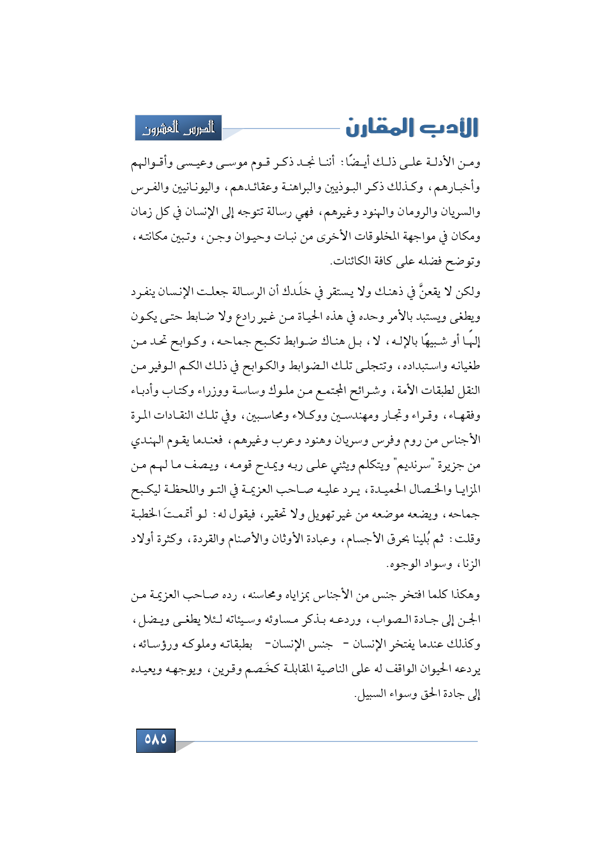ولكن لا يقعنَّ في وهنك ولا يستقر في خلَدك أن الرسالة جعلت الإنسان ينفرد ويطغى ويستبد بالأمر وحده في هذه الحياة من غير رادع ولا ضابط حتى يكون إلهًا أو شبيهًا بالإله، لا، بل هناك ضوابط تكبح جماحه، وكوابح تحد من طغيانه واستبداده، وتتجلى تلك الضوابط والكوابح في ذلك الكم الوفير من النقل لطبقات الأمة، وشرائح المجتمع من ملوك وساسة ووزراء وكتاب وأدباء وفقهاء، وقراء وتجار ومهندسين ووكلاء ومحاسبين، وفي تلك النقادات المرة الأجناس من روم وفرس وسريان وهنود وعرب وغيرهم، فعندما يقوم الهندي من جزيرة "سرنديم" ويتكلم ويثني على ربه ويمدح قومه، ويصف ما لهم من المزايا والخصال الحميدة، يرد عليه صاحب العزيمة في التو واللحظة ليكبح جماحه، ويضعه موضعه من غير تهويل ولا تحقير، فيقول له: لو أتممتَ الخطبة وقلت: ثم بُلينا بحرق الأجسام، وعبادة الأوثان والأصنام والقردة، وكثرة أولاد الزنا، وسواد الوجوه.