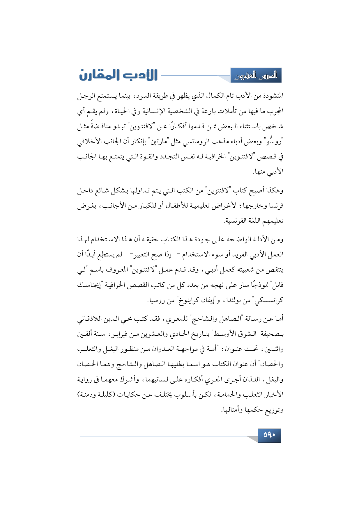 المنشودة من الأدب تام الكمال الذي يظهر في طريقة السرد، بينما يستمتع الرجل المجرب ما فيها من تأملات بارعة في الشخصية الإنسانية وفي الحياة، ولم يقم أي شخص باستثناء البعض ممن قدموا أفكارًا عن "لافنتوين" تبدو مناقضةً مثل "روسُّو" وبعض أدباء مذهب الرومانسي مثل "مارتين" بإنكار أن الجانب الأخلاقي في قصص "لافنتوين" الخرافية له نفس التجدد والقوة التي يتمتع بها الجانب الأدبي منها.