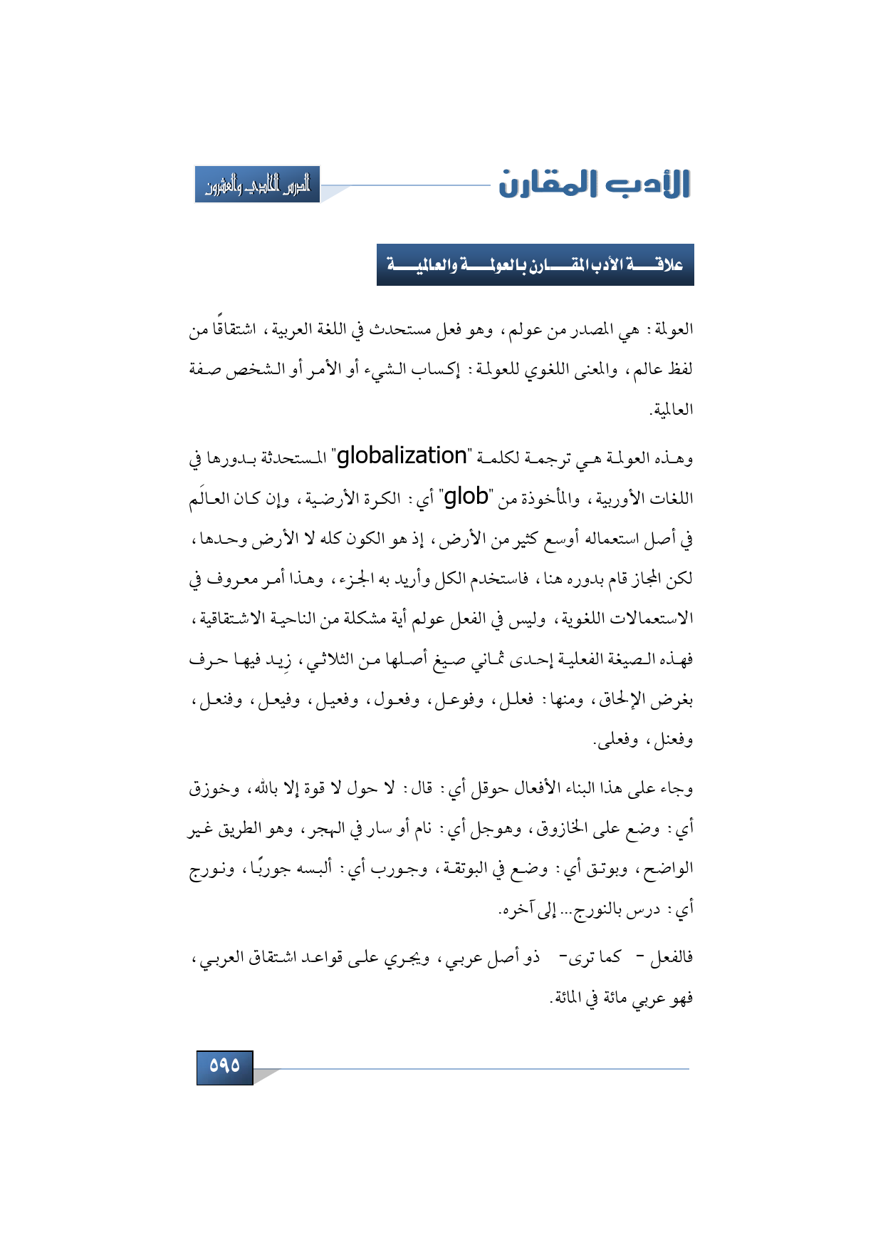 علاقة الأدب المقارن بالعولمة والعالمية والمثاقفة بين الشعوب، وبتحديد خصوصية الأدب العربي وبيان ملامحه.