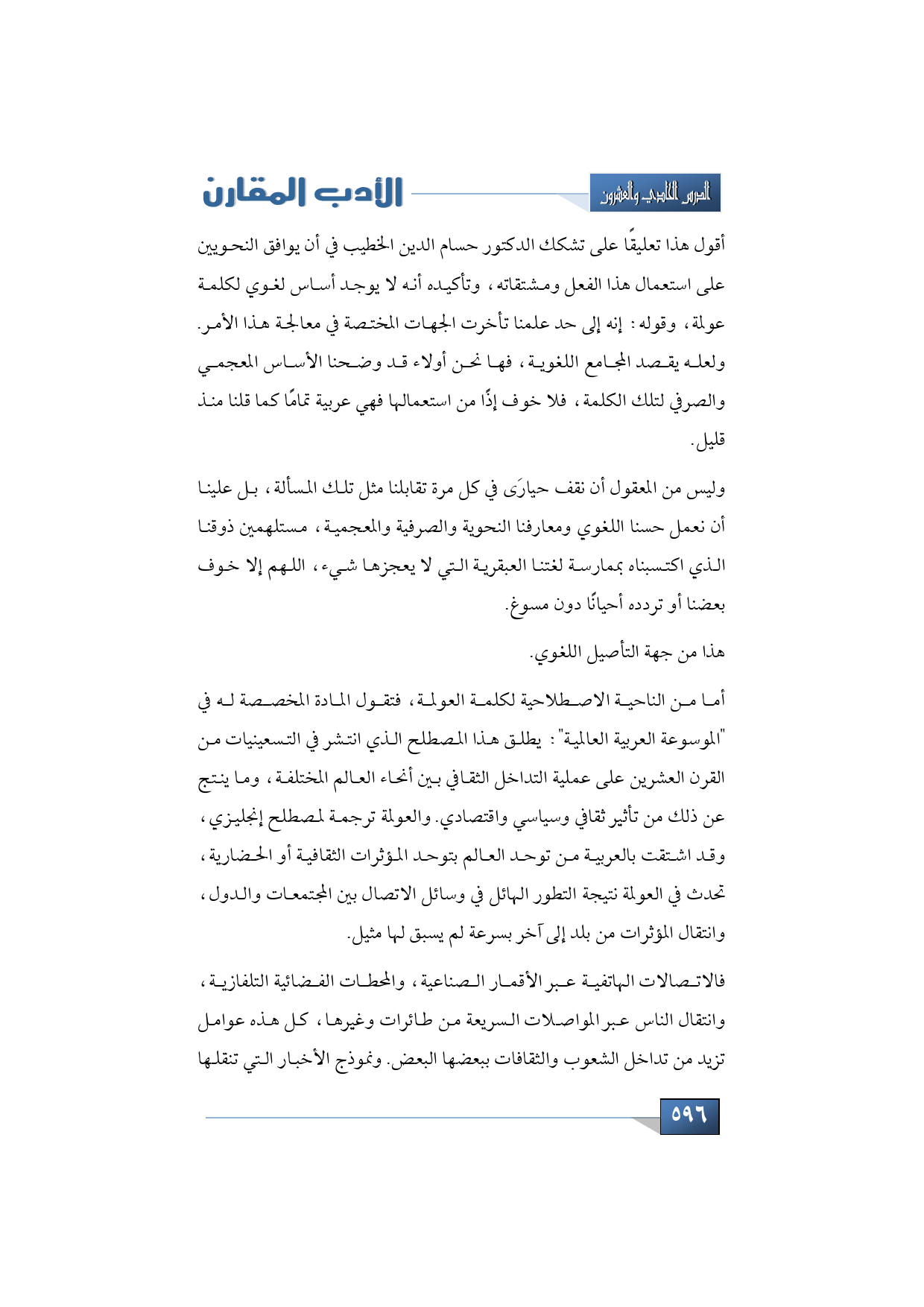 أقول هذا تعليقًا على تشكك الدكتور حسام الدين الخطيب في أن يوافق النحويين على استعمال هذا الفعل ومشتقاته، وتأكيده أنه لا يوجد أساس لغوي لكلمة عولمة، وقوله: إنه إلى حد علمنا تأخرت الجهات المختصة في معالجة هذا الأمر. ولعله يقصد المجامع اللغوية، فها نحن أولاء قد وضحنا الأساس المعجمي والصرفي لتلك الكلمة، فلا خوف إذًا من استعمالها فهي عربية تمامًا كما قلنا منذ قليل.