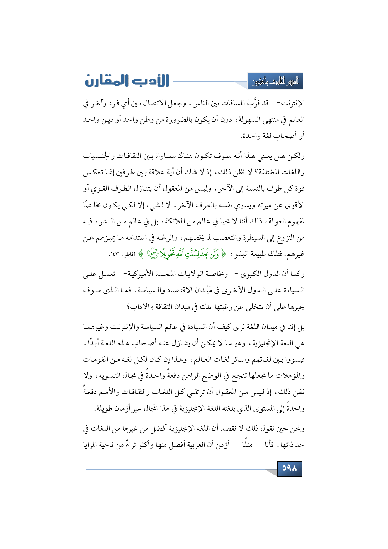 وكما أن الدول الكبرى -وبخاصة الولايات المتحدة الأميركية- تعمل على السيادة على الدول الأخرى في مَيْدان الاقتصاد والسياسة، فما الذي سوف يجبرها على أن تتخلى عن رغبتها تلك في ميدان الثقافة والآداب؟