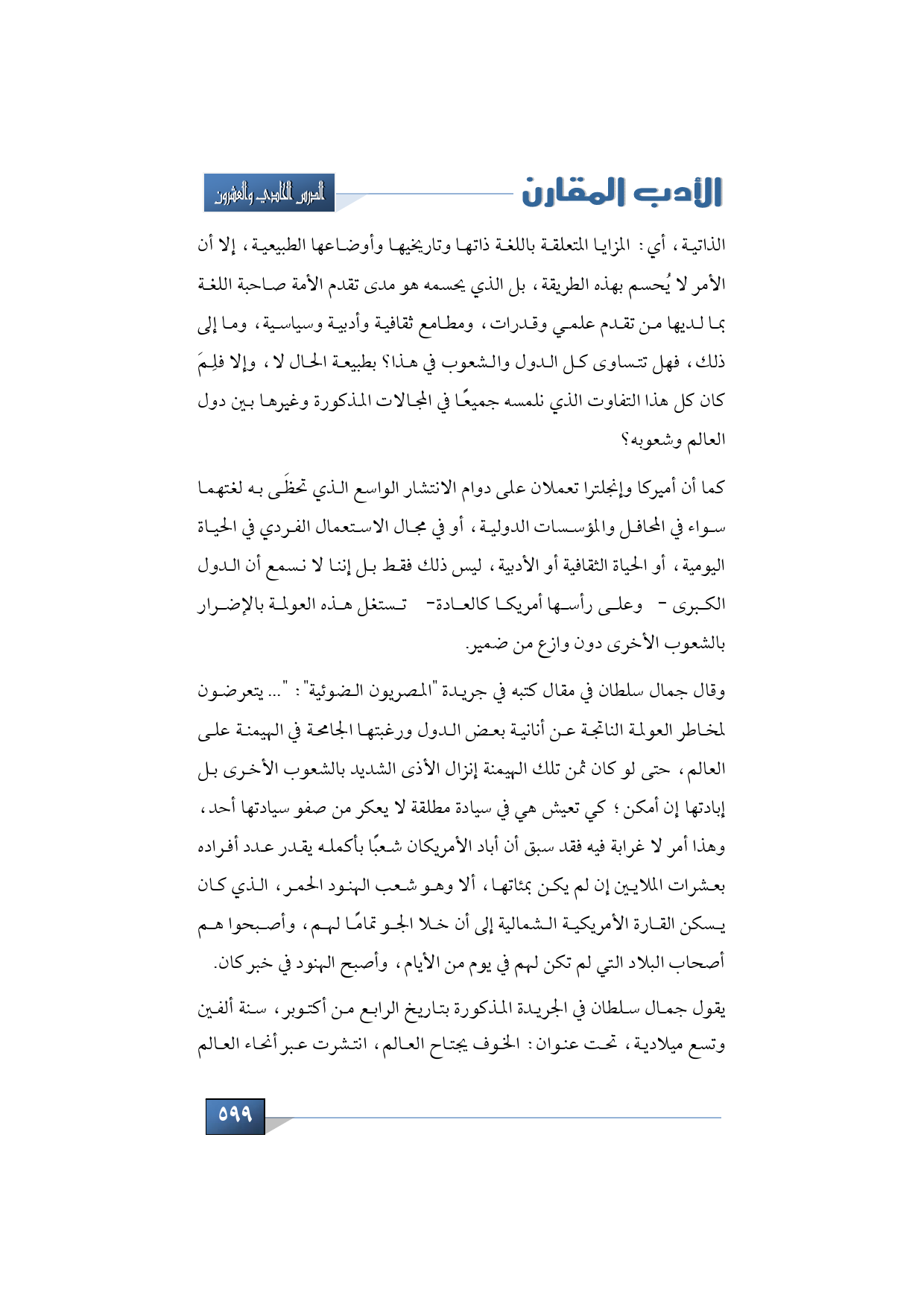 الذاتية، أي: المزايا المتعلقة باللغة ذاتها وتاريخيها وأوضاعها الطبيعية، إلا أن الأمر لا يُحسم بهذه الطريقة، بل الذي يحسمه هو مدى تقدم الأمة صاحبة اللغة بما لديها من تقدم علمي وقدرات، ومطامع ثقافية وأدبية وسياسية، وما إلى ذلك، فهل تتساوى كل الدول والشعوب في هذا؟ بطبيعة الحال لا، وإلا فلِمَ كان كل هذا التفاوت الذي نلمسه جميعًا في المجالات المذكورة وغيرها بين دول العالم وشعوبه؟
