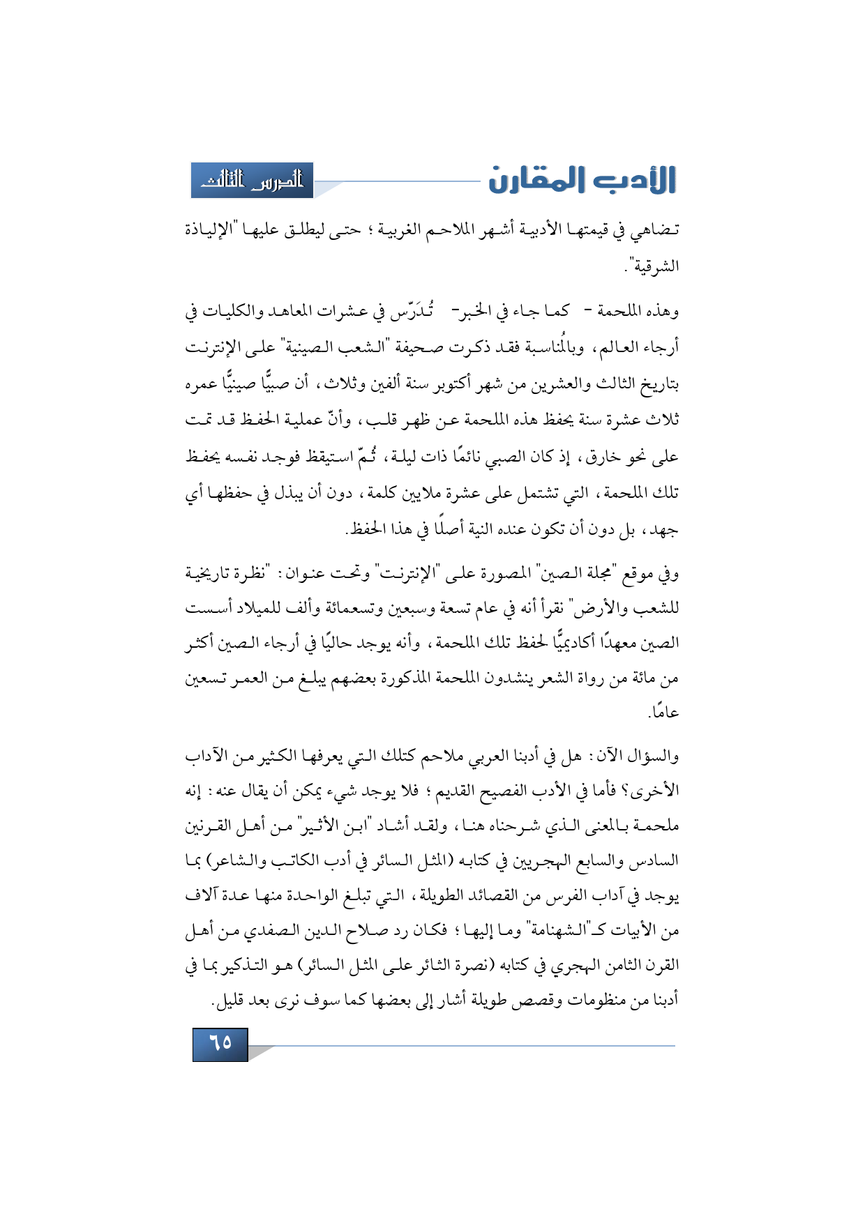 وهذه الملحمة -كما جاء في الخبر- تُدَرّس في عشرات المعاهد والكليات في أرجاء العالم, وبالمُناسبة فقد ذكرت صحيفة "الشعب الصينية" على الإنترنت بتاريخ الثالث والعشرين من شهر أكتوبر سنة ألفين وثلاث، أن صبيًّا صينيًّا عمره ثلاث عشرة سنة يحفظ هذه الملحمة عن ظهر قلب، وأنّ عملية الحفظ قد تمت على نحو خارق، إذ كان الصبي نائمًا ذات ليلة، ثُمّ استيقظ فوجد نفسه يحفظ تلك الملحمة، التي تشتمل على عشرة ملايين كلمة، دون أن يبذل في حفظها أي جهد، بل دون أن تكون عنده النية أصلًا في هذا الحفظ.