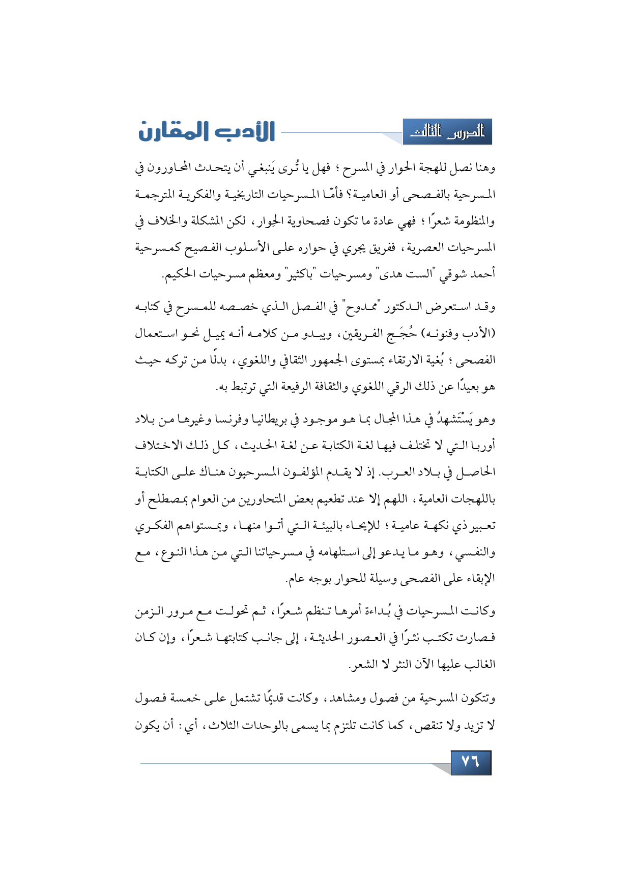 وهو يَسْتَشهدُ في هذا المجال بما هو موجود في بريطانيا وفرنسا وغيرها من بلاد أوربا التي لا تختلف فيها لغة الكتابة عن لغة الحديث، كل ذلك الاختلاف الحاصل في بلاد العرب. إذ لا يقدم المؤلفون المسرحيون هناك على الكتابة باللهجات العامية، اللهم إلا عند تطعيم بعض المتحاورين من العوام بمصطلح أو تعبير ذي نكهة عامية؛ للإيحاء بالبيئة التي أتوا منها، وبمستواهم الفكري والنفسي، وهو ما يدعو إلى استلهامه في مسرحياتنا التي من هذا النوع، مع الإبقاء على الفصحى وسيلة للحوار بوجه عام.