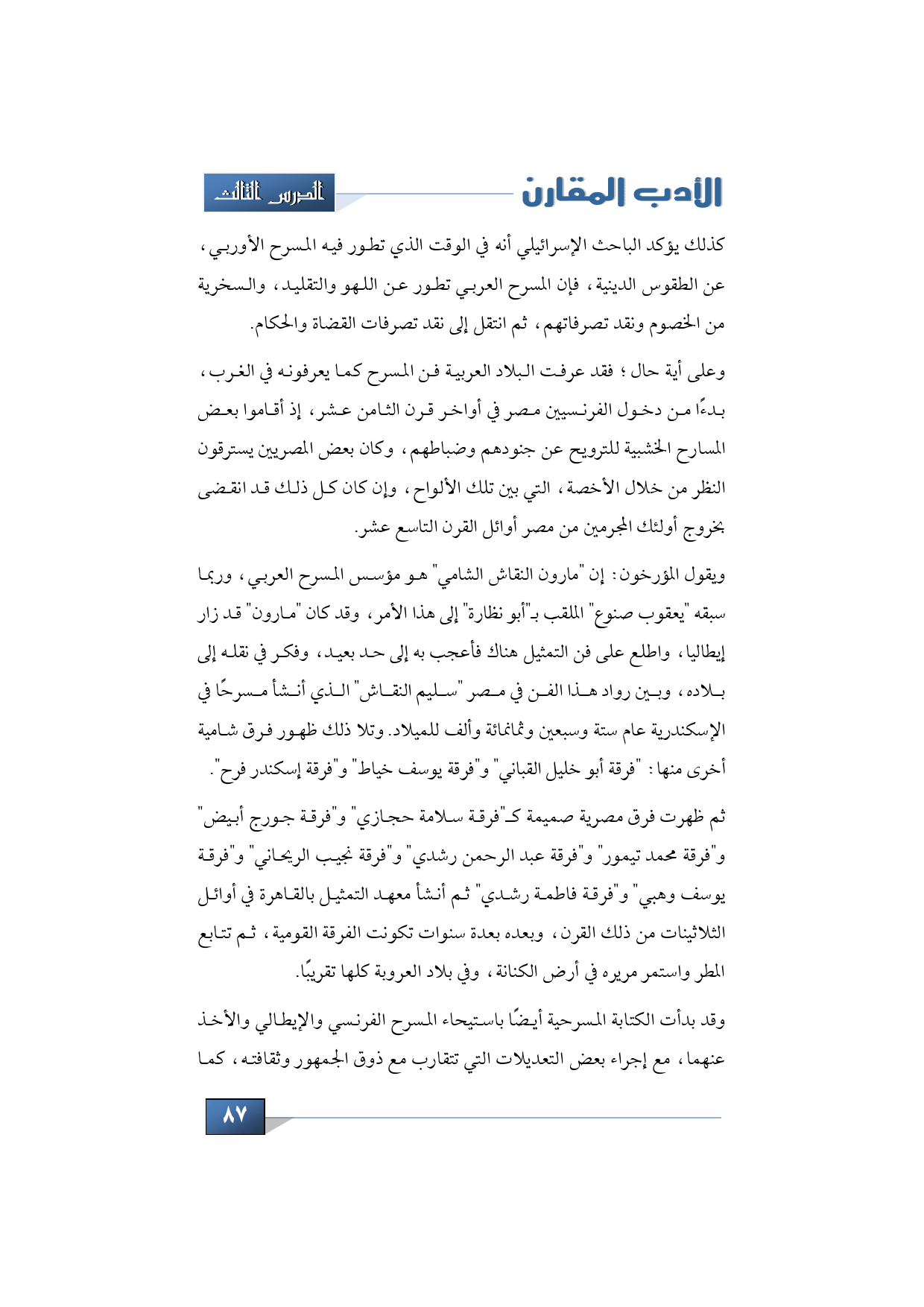 ويقول المؤرخون: إن "مارون النقاش الشامي" هو مؤسس المسرح العربي، وربما سبقه "يعقوب صنوع" الملقب بـ"أبو نظارة" إلى هذا الأمر, وقد كان "مارون" قد زار إيطاليا، واطلع على فن التمثيل هناك فأعجب به إلى حد بعيد، وفكر في نقله إلى بلاده, وبين رواد هذا الفن في مصر "سليم النقاش" الذي أنشأ مسرحًا في الإسكندرية عام ستة وسبعين وثمانمائة وألف للميلاد. وتلا ذلك ظهور فرق شامية أخرى منها: "فرقة أبو خليل القباني" و"فرقة يوسف خياط" و"فرقة إسكندر فرح".