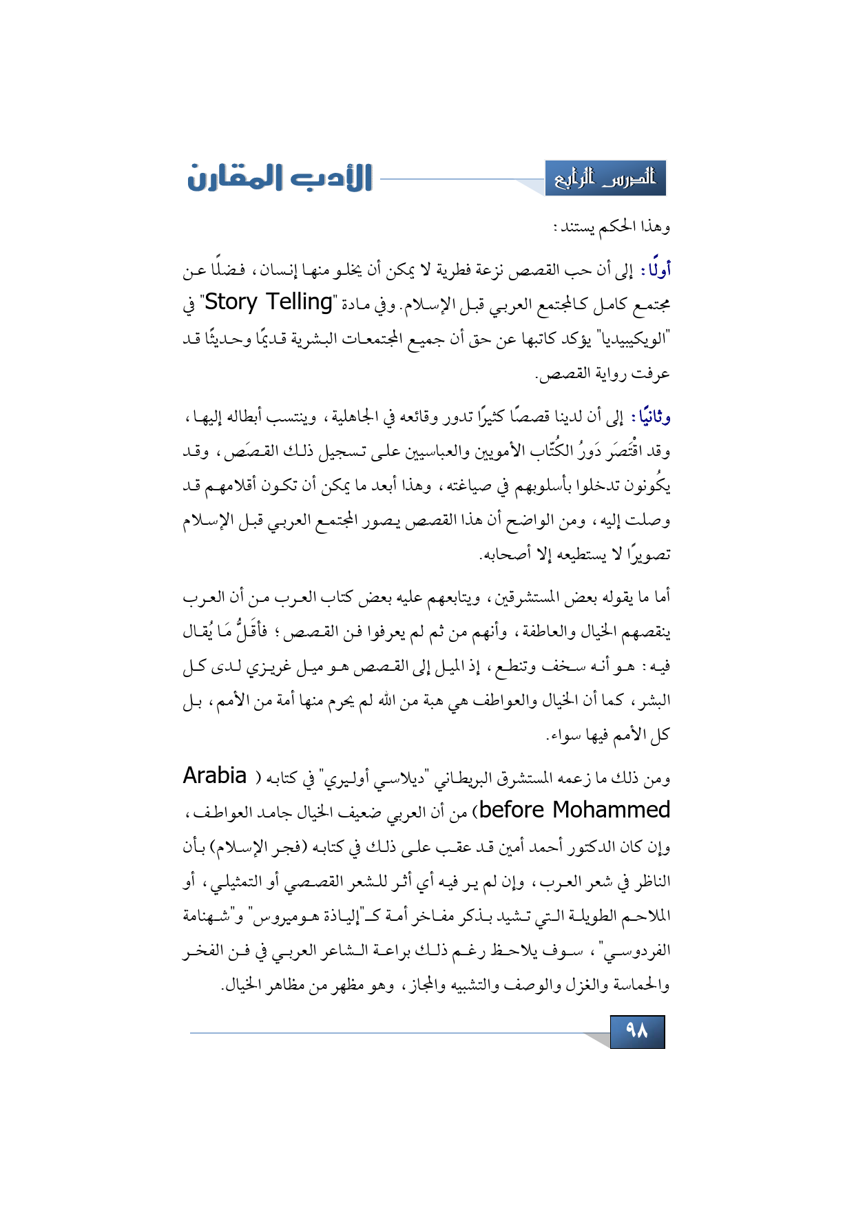 أما ما يقوله بعض المستشرقين، ويتابعهم عليه بعض كتاب العرب من أن العرب ينقصهم الخيال والعاطفة، وأنهم من ثم لم يعرفوا فن القصص؛ فأقَلُّ مَا يُقال فيه: هو أنه سخف وتنطع، إذ الميل إلى القصص هو ميل غريزي لدى كل البشر، كما أن الخيال والعواطف هي هبة من الله لم يحرم منها أمة من الأمم، بل كل الأمم فيها سواء.