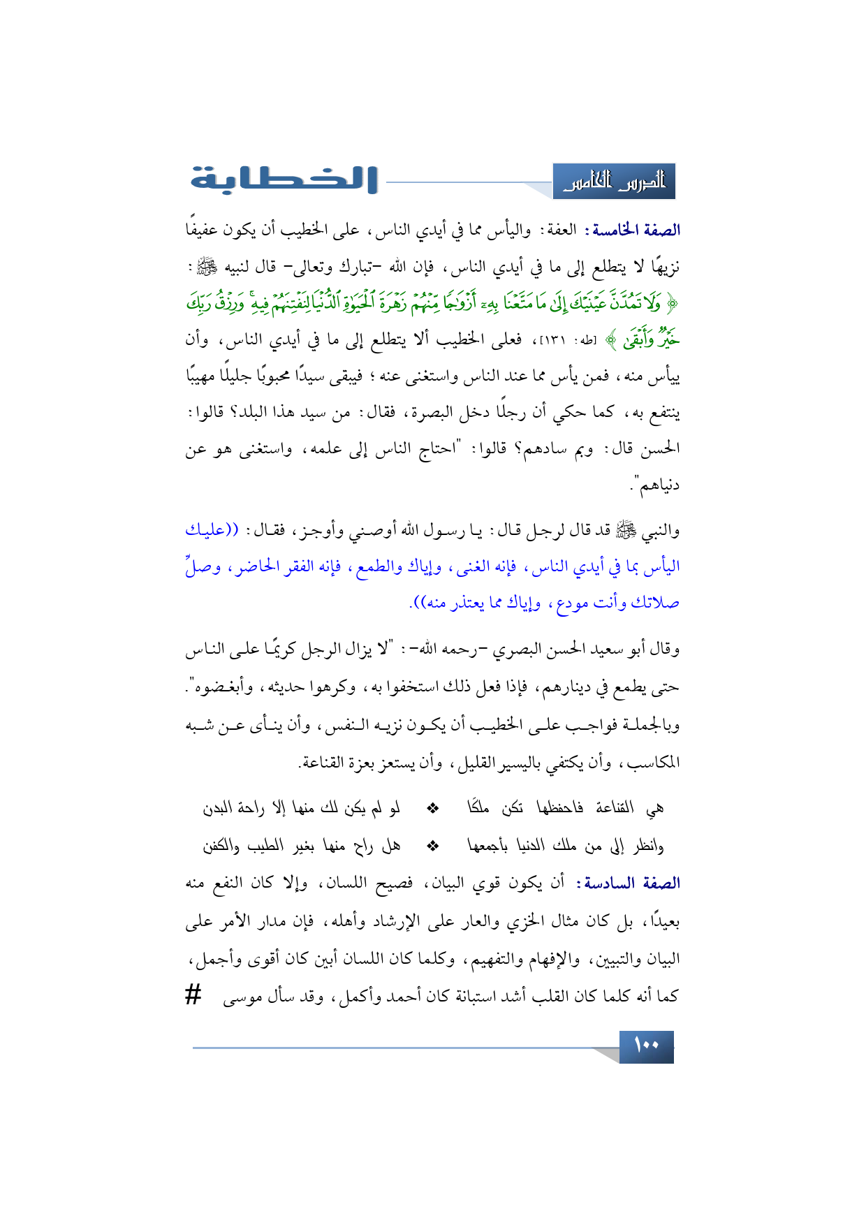 الصفة الخامسة: العفة واليأس مما في أيدي الناس، على الخطيب أن يكون عفيفًا نزيهًا لا يتطلع إلى ما في أيدي الناس، فإن الله -تبارك وتعالى- قال لنبيه -عليه الصلاة والسلام-: {وَلَا تَمُدَّنَّ عَيْنَيْكَ إِلَى مَا مَتَّعْنَا بِهِ أَزْوَاجًا مِنْهُمْ زَهْرَةَ الْحَيَاةِ الدُّنْيَا لِنَفْتِنَهُمْ فِيهِ وَرِزْقُ رَبِّكَ خَيْرٌ وَأَبْقَى} (طه: 131)، فعلى الخطيب ألا يتطلع إلى ما في أيدي الناس، وأن ييأس منه، فمن يأس مما عند الناس استغنى عنه فيبقى سيدًا محبوبًا جليلًا مهيبًا ينتفع به كما حكي أن رجلًا دخل البصرة، فقال: من سيد هذا البلد؟ قالوا: الحسن قال: وبم سادهم؟ قالوا: "احتاج الناس إلى علمه واستغنى هو عن دنياهم".