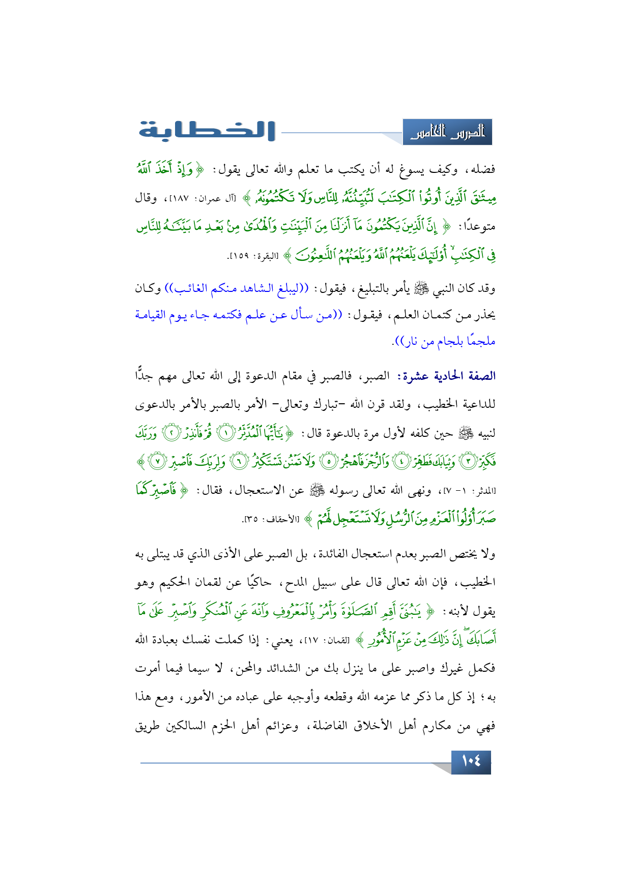 ومن أهم الصفات التي يجب على الخطيب أن يتحلى بها: الصبر، فالصبر في مقام الدعوة إلى الله تعالى مهم جدًّا للداعية الخطيب، ولقد قرن الله -تبارك وتعالى- الأمر بالصبر بالأمر بالدعوى لنبيه -عليه الصلاة والسلام- حين كلفه لأول مرة بالدعوة قال: {يَا أَيُّهَا الْمُدَّثِّرُ * قُمْ فَأَنْذِرْ * وَرَبَّكَ فَكَبِّرْ * وَثِيَابَكَ فَطَهِّرْ * وَالرُّجْزَ فَاهْجُرْ * وَلَا تَمْنُنْ تَسْتَكْثِرُ * وَلِرَبِّكَ فَاصْبِرْ} (المدثر: 1 - 7)، ونهى الله تعالى رسوله -صلى الله عليه وسلم- عن الاستعجال فقال: {فَاصْبِرْ كَمَا صَبَرَ أُولُو الْعَزْمِ مِنَ الرُّسُلِ وَلَا تَسْتَعْجِلْ لَهُمْ} (الأحقاف: 35).
