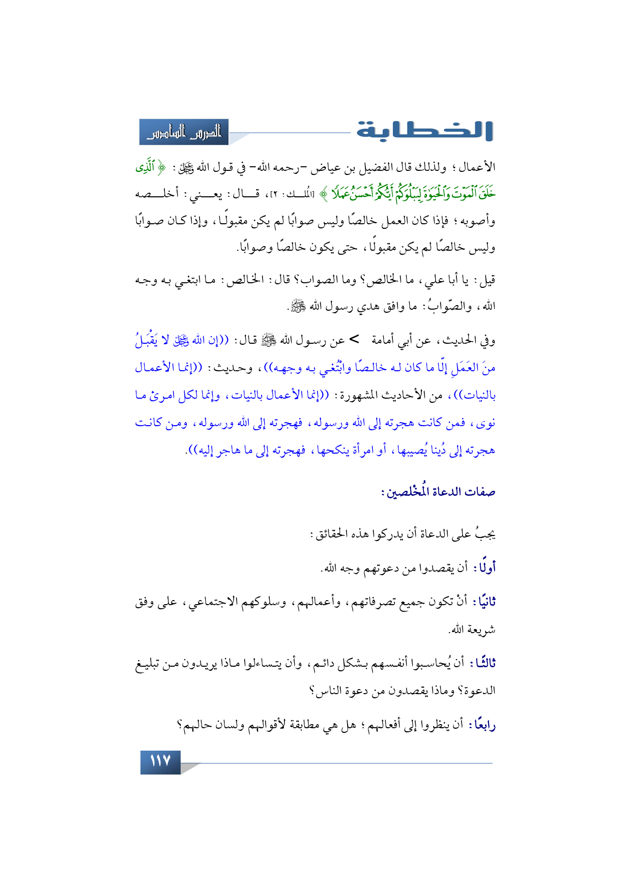 الأعمال، ولذلك قال الفضيل بن عياض -رحمه الله- في قول الله عز وجل: {الَّذِي خَلَقَ الْمَوْتَ وَالْحَيَاةَ لِيَبْلُوَكُمْ أَيُّكُمْ أَحْسَنُ عَمَلًا} (المُلك: 2) قال: يعني أخلصه وأصوبه؛ فإذا كان العمل خالصًا وليس صوابًا لم يكن مقبولًا، وإذا كان صوابًا وليس خالصًا لم يكن مقبولًا حتى يكون خالصًا وصوابًا.