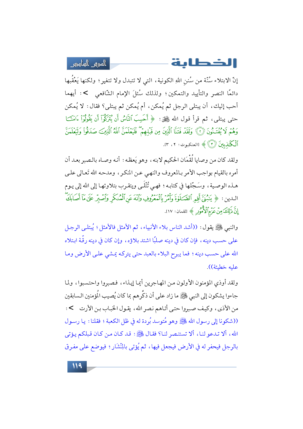 ولقد كان من وصايا لُقْمَان الحكيم لابنه وهو يَعظه: أنه وصاه بالصبر بعد أن أمره بالقيام بواجب الأمر بالمعروف والنهي عن المنكر، ومدحه الله تَعالى على هذه الوصية، وسَجّلها في كتابه؛ فهي تُتْلَى ويتقرب بتلاوتها إلى الله إلى يوم الدين: {يَا بُنَيَّ أَقِمِ الصَّلاَةَ وَأْمُرْ بِالْمَعْرُوفِ وَانْهَ عَنِ الْمُنكَرِ وَاصْبِرْ عَلَى مَا أَصَابَكَ إِنَّ ذَلِكَ مِنْ عَزْمِ الأُمُور} (لقمان: 17).