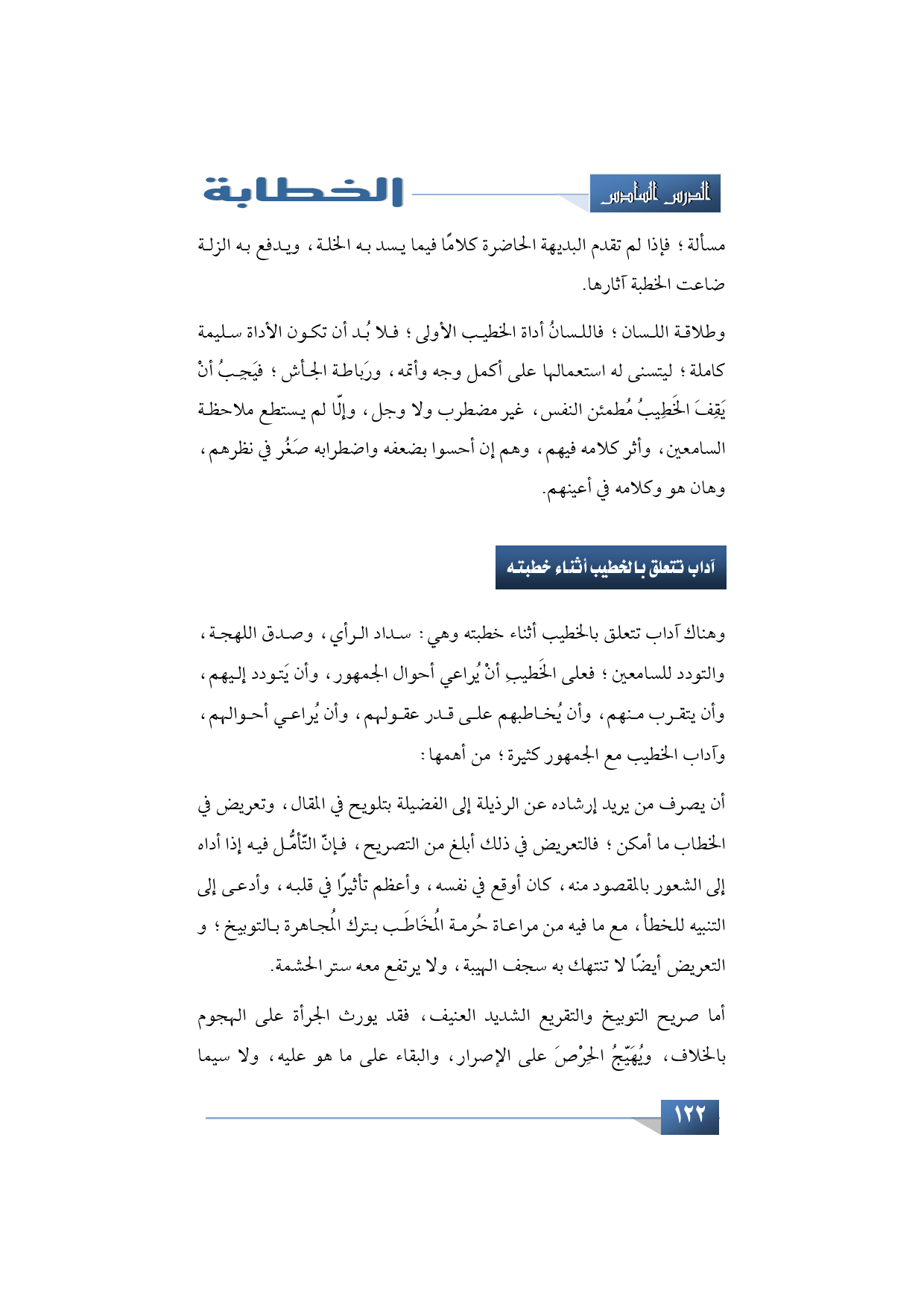 وطلاقة اللسان فاللسانُ أداة الخطيب الأولى؛ فلا بُد أن تكون الأداة سليمة كاملة؛ ليتسنى له استعمالها على أكمل وجه وأتمه، ورَباطة الجأش؛ فيَجِبُ أنْ يَقِفَ الخَطِيبُ مُطمئن النفس، غير مضطرب ولا وجل، وإلّا لم يستطع ملاحظة السامعين، وأثر كلامه فيهم، وهم إن أحسوا بضعفه واضطرابه صَغُر في نظرهم، وهان هو وكلامه في أعينهم.