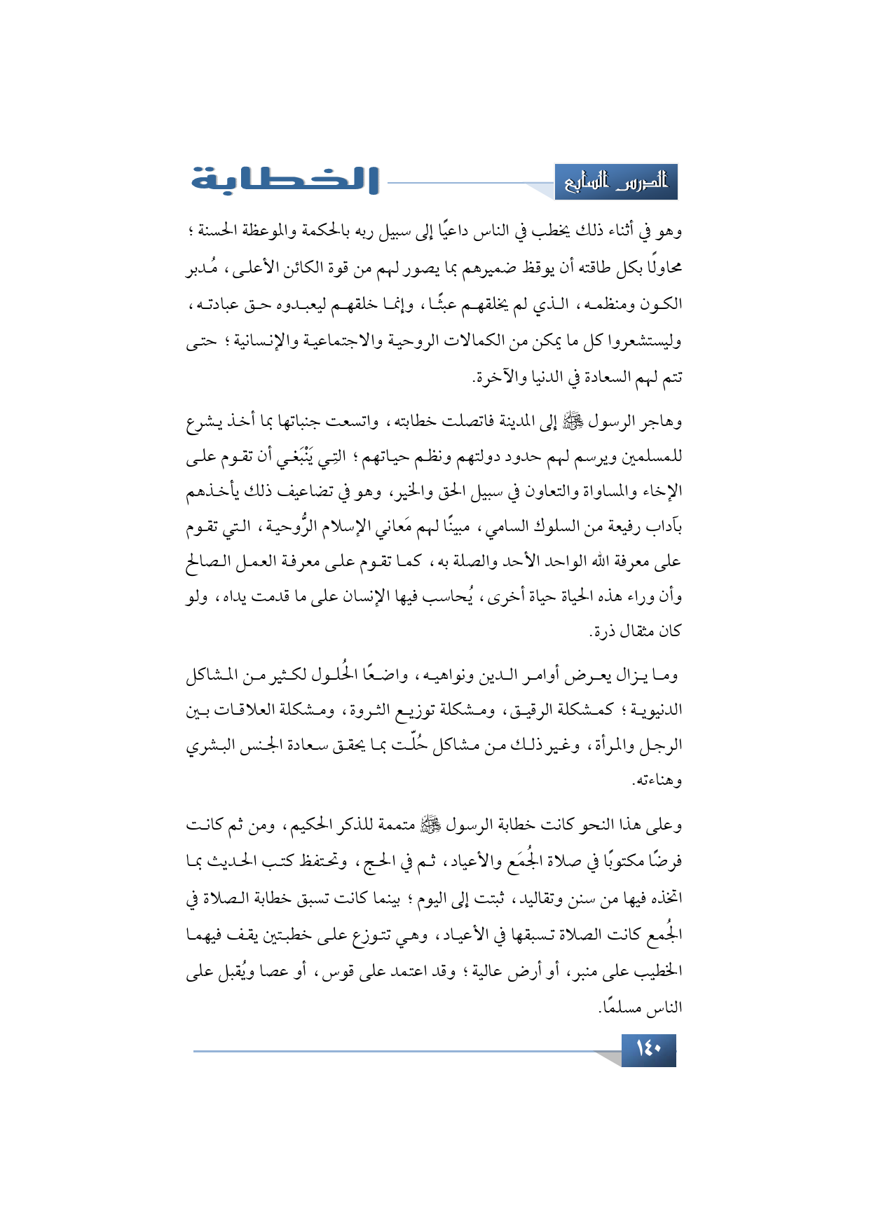 وهاجر الرسول -صلى الله عليه وسلم- إلى المدينة فاتصلت خطابته، واتسعت جنباتها بما أخذ يشرع للمسلمين ويرسم لهم حدود دولتهم ونظم حياتهم؛ التِي يَنْبَغي أن تقوم على الإخاء والمساواة والتعاون في سبيل الحق والخير، وهو في تضاعيف ذلك يأخذهم بآداب رفيعة من السلوك السامي، مبينًا لهم مَعاني الإسلام الرُّوحية، التي تقوم على معرفة الله الواحد الأحد والصلة به، كما تقوم على معرفة العمل الصالح وأن وراء هذه الحياة حياة أخرى، يُحاسب فيها الإنسان على ما قدمت يداه، ولو كان مثقال ذرة.