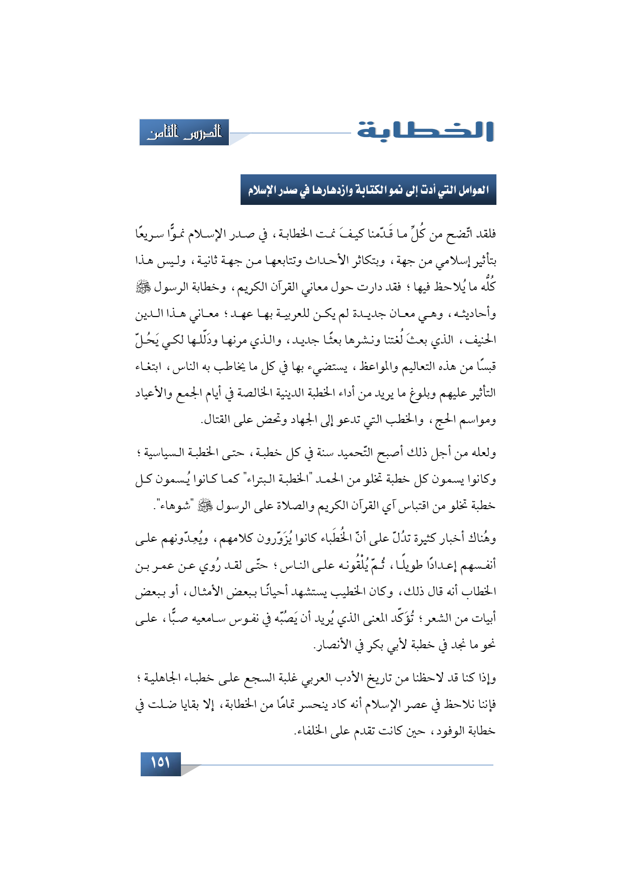 فلقد اتّضح من كُلِّ ما قَدّمنا كيفَ نمت الخطابة، في صدر الإسلام نموًّا سريعًا بتأثير إسلامي من جهة، وبتكاثر الأحداث وتتابعها من جهة ثانية، وليس هذا كُلُّه ما يُلاحظ فيها؛ فقد دارت حول معاني القرآن الكريم، وخطابة الرسول -صلى الله عليه وسلم- وأحاديثه، وهي معان جديدة لم يكن للعربية بها عهد؛ معاني هذا الدين الحنيف، الذي بعثَ لُغتنا ونشرها بعثًا جديد، والذي مرنها ودَلّلها لكي يَحُلّ قبسًا من هذه التعاليم والمواعظ، يستضيء بها في كل ما يخاطب به الناس، ابتغاء التأثير عليهم وبلوغ ما يريد من أداء الخطبة الدينية الخالصة في أيام الجمع والأعياد ومواسم الحج. والخطب التي تدعو إلى الجهاد وتحض على القتال.