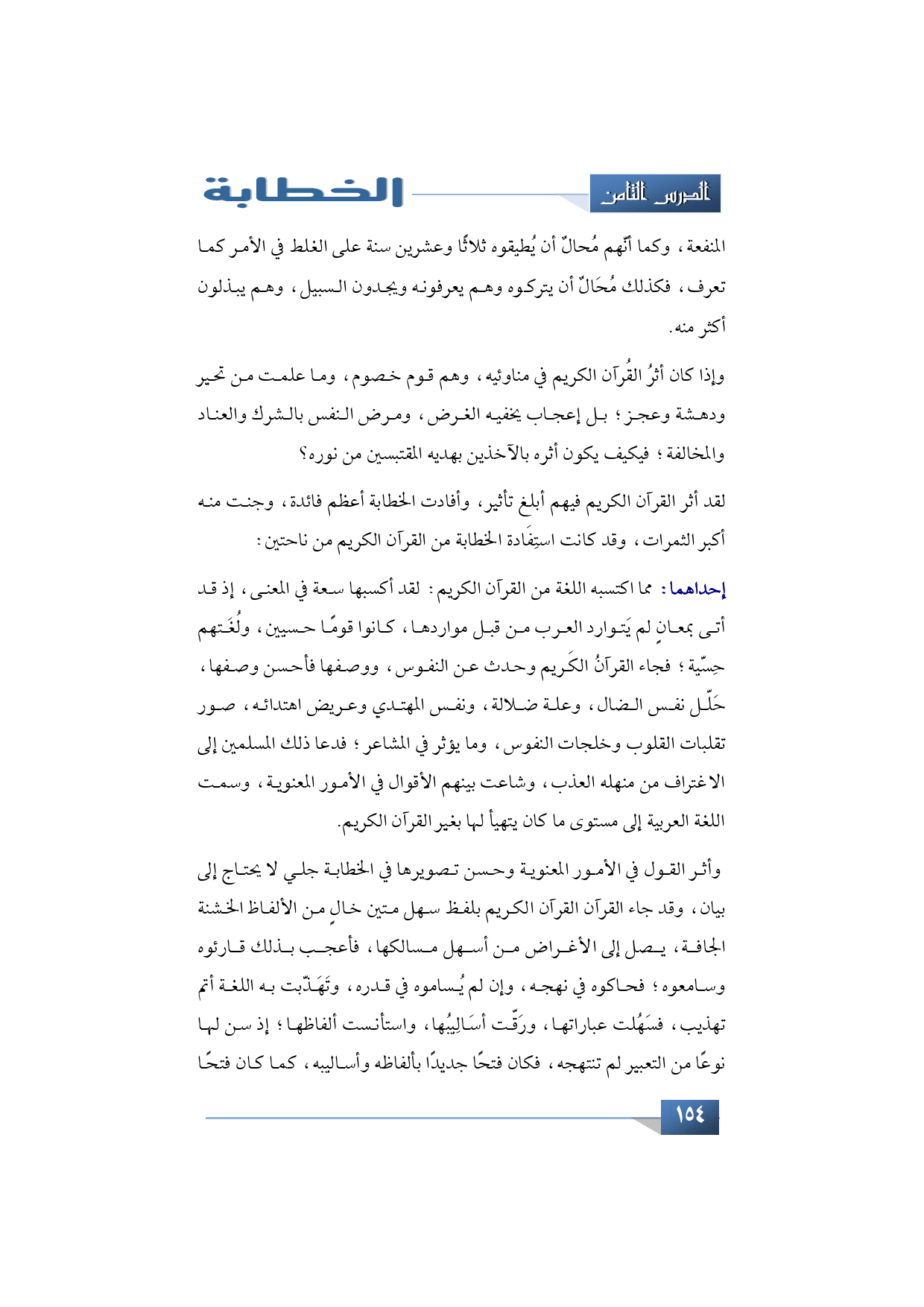 وأثر القول في الأمور المعنوية وحسن تصويرها في الخطابة جلي لا يحتاج إلى بيان، وقد جاء القرآن القرآن الكريم بلفظ سهل متين خالٍ من الألفاظ الخشنة الجافة، يصل إلى الأغراض من أسهل مسالكها، فأعجب بذلك قارئوه وسامعوه؛ فحاكوه في نهجه، وإن لم يُساموه في قدره، وتَهَذّبت به اللغة أتم تهذيب، فسَهُلت عباراتها، ورَقّت أسَالِيبُها، واستأنست ألفاظها، إذ سن لها نوعًا من التعبير لم تنتهجه، فكان فتحًا جديدًا بألفاظه وأساليبه، كما كان فتحًا