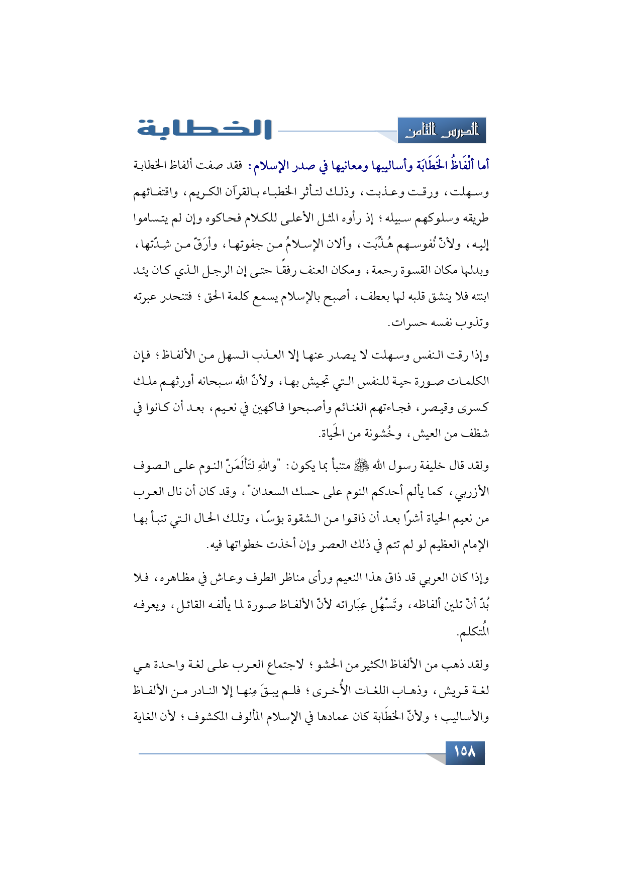 ولقد ذهب من الألفاظ الكثير من الحشو؛ لاجتماع العرب على لغة واحدة هي لغة قريش، وذهاب اللغات الأُخرى؛ فلم يبقَ مِنها إلا النادر من الألفاظ والأساليب؛ ولأنّ الخطَابة كان عمادها في الإسلام المألوف المكشوف، لأن الغاية