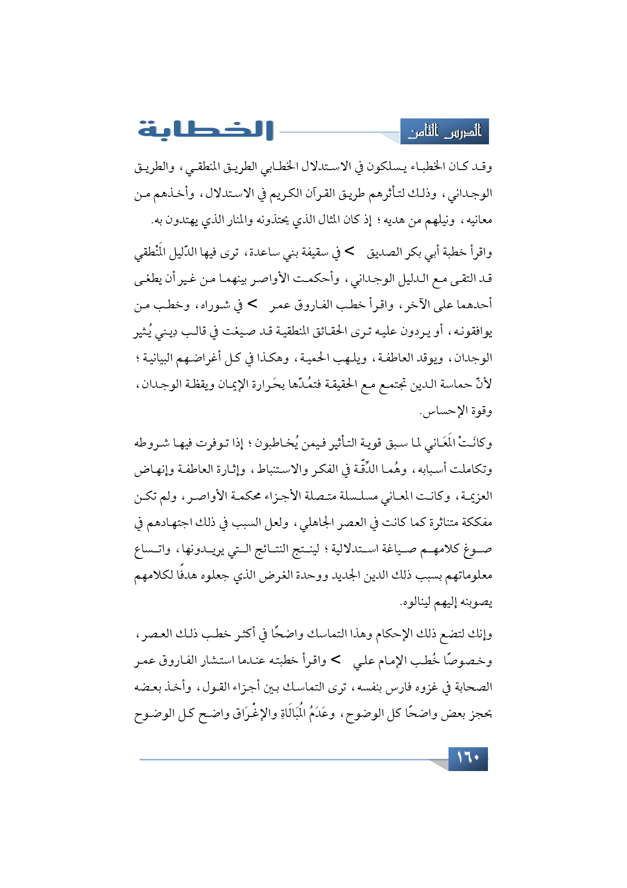 واقرأ خطبة أبي بكر الصديق -رضي الله عنه- في ثقيفة بني ساعدة ترى فيها الدّليل المَنْطقي قد التقى مع الدليل الوجداني، وأحكمت الأواصر بينهما من غير أن يطغى أحدهما على الآخر، واقرأ خطب الفاروق عمر -رضي الله عنه- في شوراه، وخطب من يوافقونه، أو يردون عليه ترى الحقائق المنطقية قد صيغت في قالب دِيني يُثير الوجدان، ويوقد العاطفة، ويلهب الحمية، وهكذا في كل أغراضهم البيانية؛ لأنّ حماسة الدين تجتمع مع الحقيقة فتمُدّها بِحَرارة الإيمان ويقظة الوجدان، وقوة الإحساس.