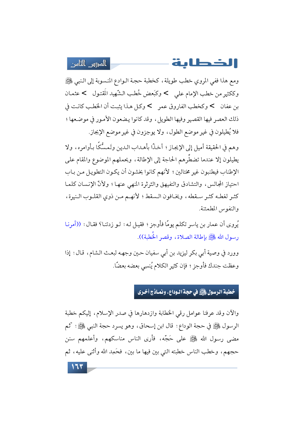 ومع هذا ففي المروي خطب طويلة، كخطبة حجة الوادع المنسوبة إلى النبي -صلى الله عليه وسلم- وككثير من خطب الإمام علي -رضي الله عنه- وكبَعض خُطب الشّهيد المَقتول -رضي الله عنه- عثمان بن عفان -رضي الله عنه- وكخطب الفاروق عمر -رضي الله عنه- وكل هذا يثبت أن الخطب كانت في ذلك العصر فيها القصير وفيها الطويل، وقد كانوا يضعون الأمور في موضعها؛ فلا يُطيلون في غير موضع الطول، ولا يجوزون في غير موضع الإيجاز.