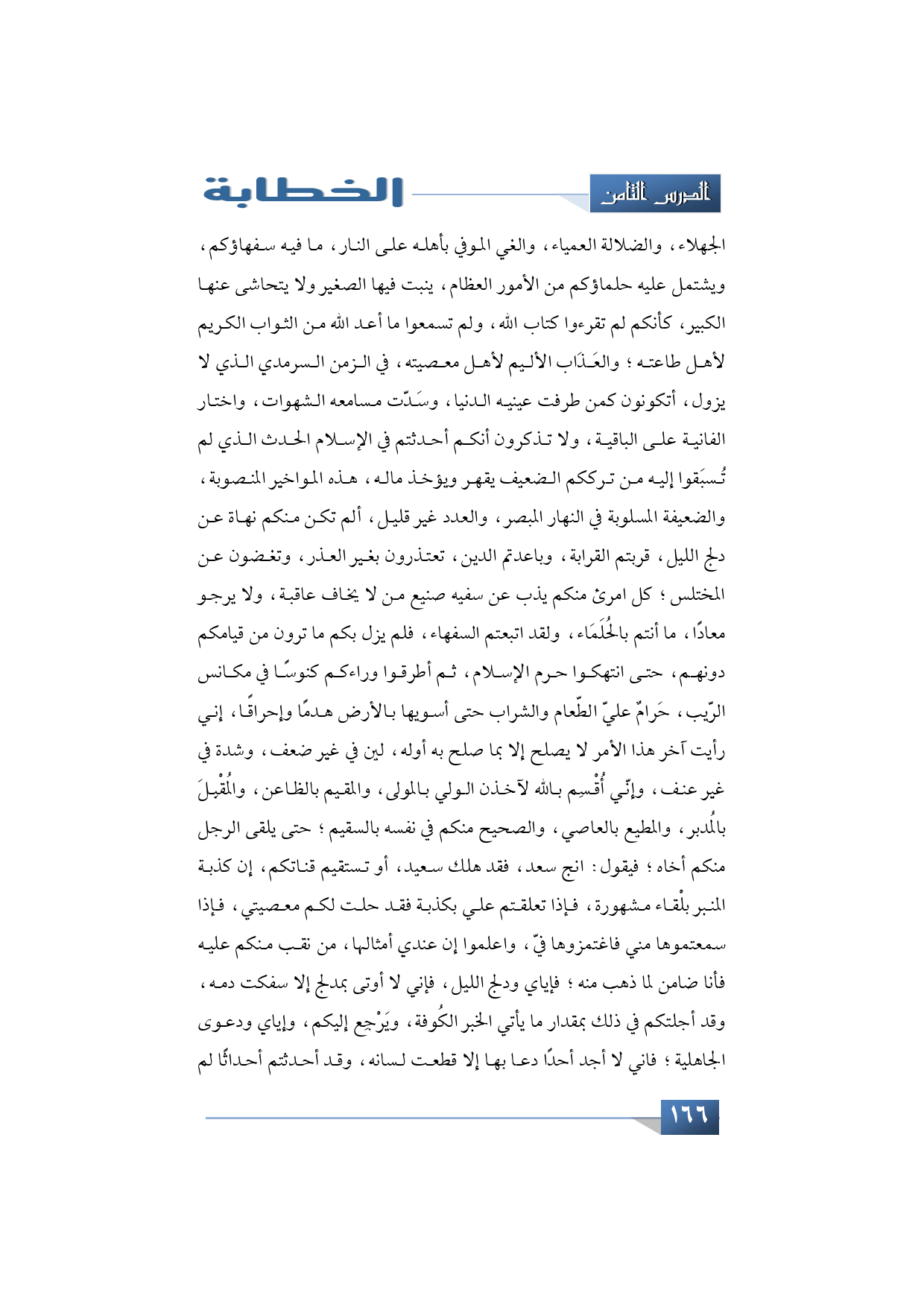 الجهلاء والضلالة العمياء، والغي الموفي بأهله على النار، ما فيه سفهاؤكم، ويشتمل عليه حلماؤكم من الأمور العظام، ينبت فيها الصغير ولا يتحاشى عنها الكبير، كأنكم لم تقرءوا كتاب الله، ولم تسمعوا ما أعد الله من الثواب الكريم لأهل طاعته؛ والعَذَاب الأليم لأهل معصيته، في الزمن السرمدي الذي لا يزول، أتكونون كمن طرفت عينيه الدنيا، وسَدّت مسامعه الشهوات واختار الفانية على الباقية.