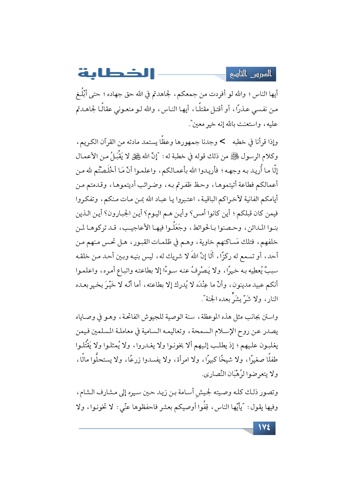 وتصور ذلك كله وصيته لجيشِ أسامة بن زيد حين سيره إلى مشارف الشام، وفيها يقول: "يأيّها الناس، قِفُوا أوصيكم بعشر فاحفظوها عنّي: لا تخونوا ولا