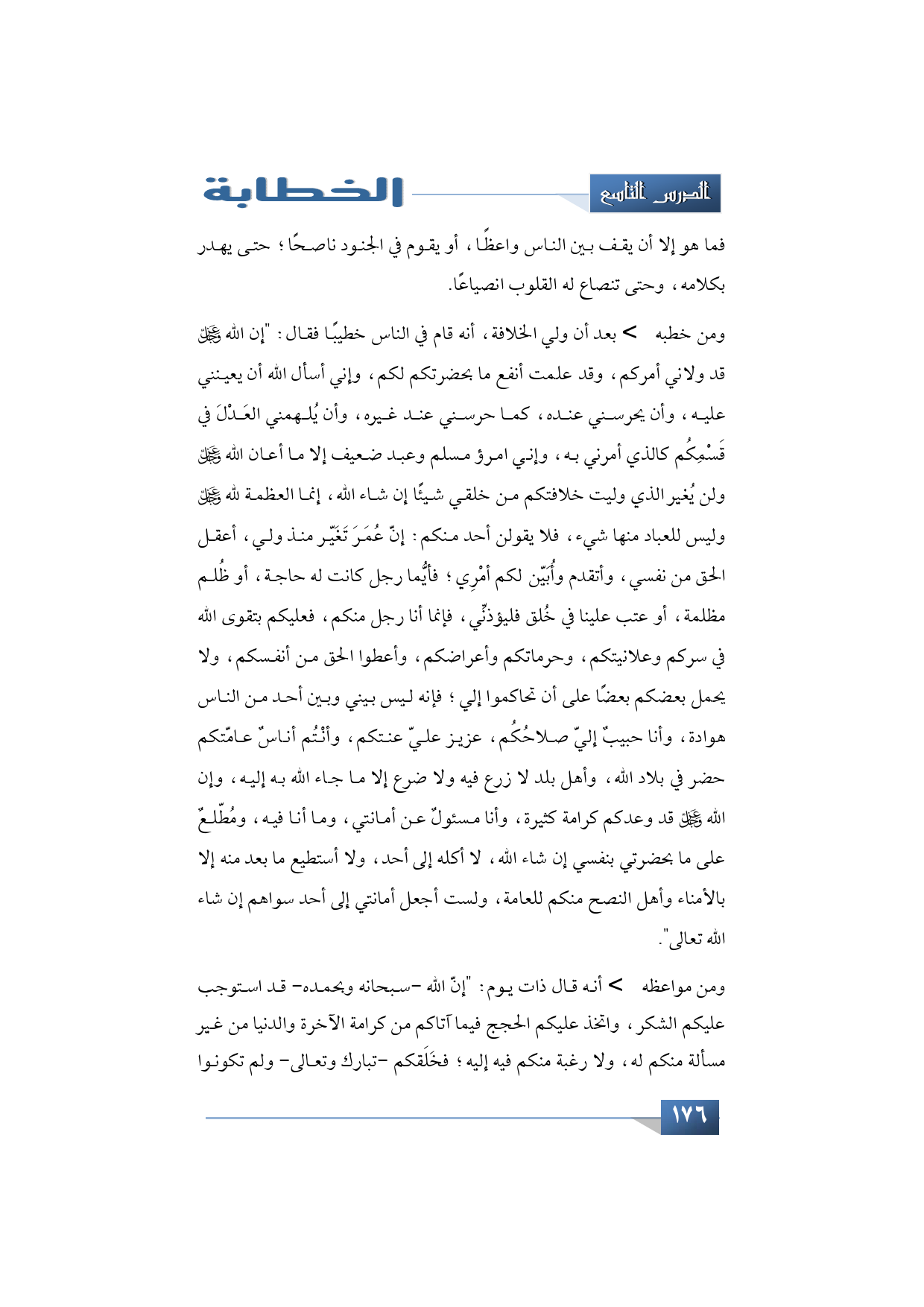 فعليكم بتقوى الله في سركم وعلانيتكم، وحرماتكم وأعراضكم، وأعطوا الحق من أنفسكم، ولا يحمل بعضكم بعضًا على أن تحاكموا إلي؛ فإنه ليس بيني وبين أحد من الناس هوادة، وأنا حبيبٌ إليّ صلاحُكُم، عزيز عليّ عنتكم، وأنْتُم أناسٌ عامّتكم حضر في بلاد الله، وأهل بلد لا زرع فيه ولا ضرع إلا ما جاء الله به إليه، وإن الله -عز وجل- قد وعدكم كرامة كثيرة، وأنا مسئولٌ عن أمانتي، وما أنا فيه، ومُطّلعٌ على ما بحضرتي بنفسي إن شاء الله، لا أكله إلى أحد، ولا أستطيع ما بعد منه إلا بالأمناء وأهل النصح منكم للعامة، ولست أجعل أمانتي إلى أحد سواهم إن شاء الله تعالى".
