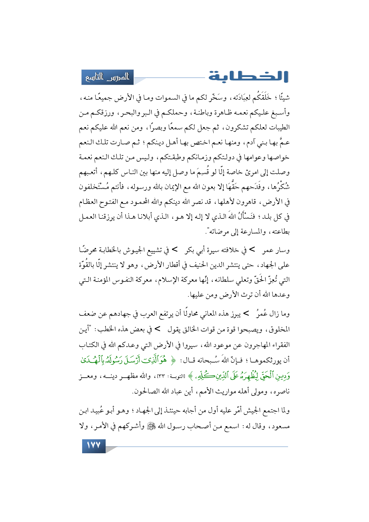 وما زال عُمرُ -رضي الله عنه- يبرز هذه المعاني محاولًا أن يرتفع العرب في جهادهم عن ضعف المخلوق، ويصبحوا قوة من قوات الخالق يقول -رضي الله عنه- في بعض هذه الخطب: "أين الفقراء المهاجرون عن موعود الله، سيروا في الأرض التي وعدكم الله في الكتاب أن يورثكموها؛ فإنّ اللهَ سُبحانه قال: {هُوَ الَّذِي أَرْسَلَ رَسُولَهُ بِالْهُدَى وَدِينِ الْحَقِّ لِيُظْهِرَهُ عَلَى الدِّينِ كُلِّهِ} (التوبة: 33)، والله مظهر دينه، ومعز ناصره، ومولى أهله مواريث الأمم، أين عباد الله الصالحون.