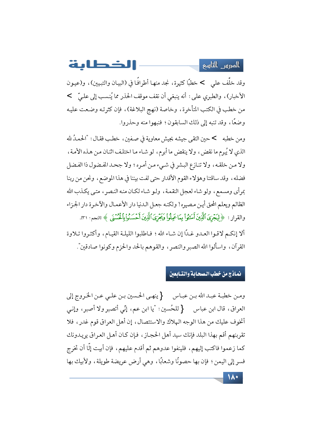 ومن خطبة عبد الله بن عباس -رضي الله عنهما- ينهى الحسين بن علي عن الخروج إلى العراق، قال ابن عباس -رضي الله عنهما- للحُسين: "يا ابن عم، إنّي أتصبر ولا أصبر، وإني أتخوف عليك من هذا الوجه الهلاك والاستئصال، إن أهل العراق قوم غدر، فلا تقربنهم أقم بهذا البلد فإنك سيد أهل الحجاز، فإن كان أهل العراق يريدونك كما زعموا فاكتب إليهم، فلينفوا عدوهم ثم أقدم عليهم.