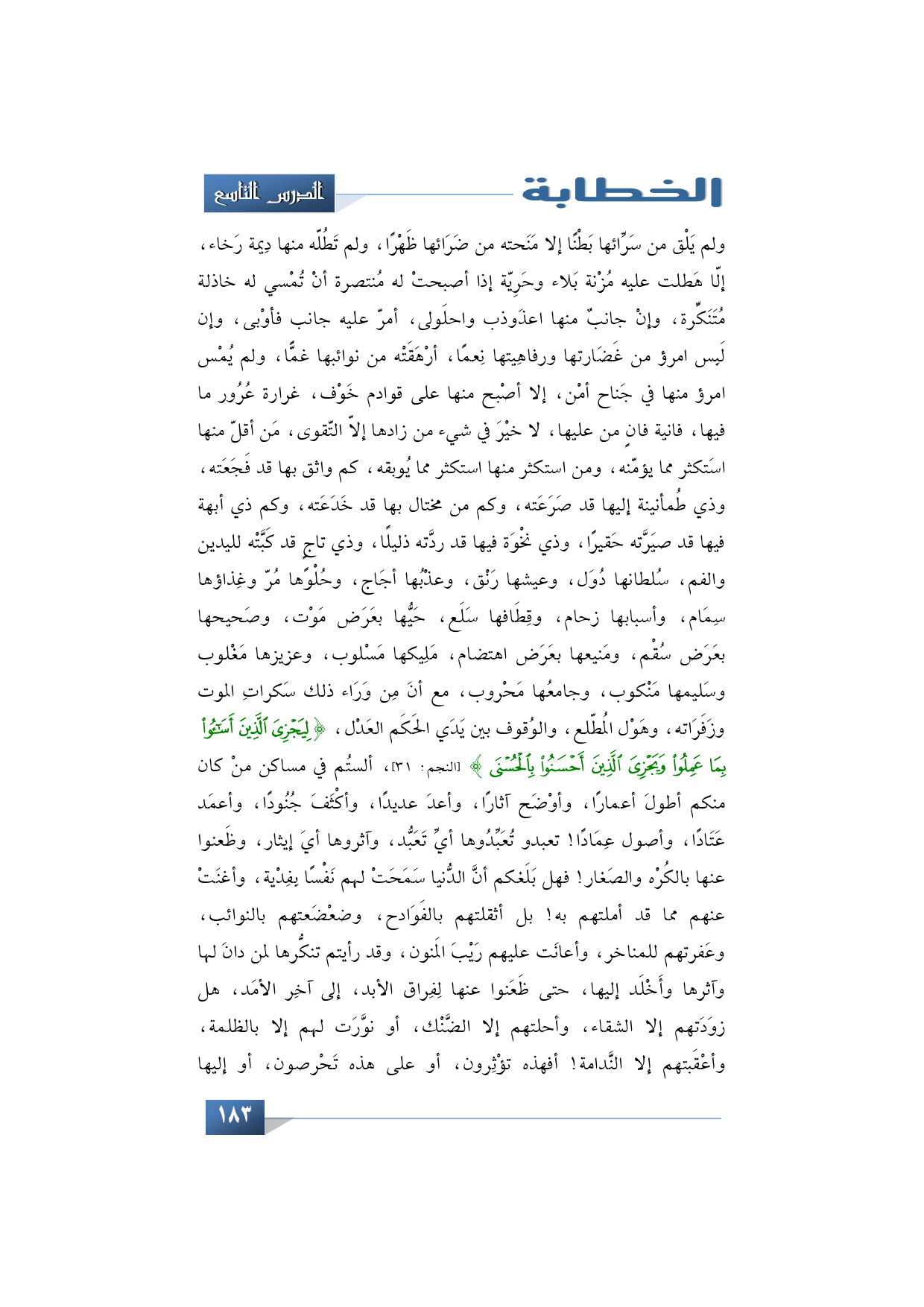 سُلطانها دُوَل، وعيشها رَنْق، وعذْبُها أجَاج، وحُلْوًها مُرّ وغِذاؤها سِمَام، وأسبابها زحام، وقِطَافها سَلَع. حَيُّها بعَرَض مَوْت، وصَحيحها بعَرَض سُقْم، ومَنيعها بعَرَض اهتضام. مَلِيكها مَسْلوب، وعزيزها مَغْلوب وسَليمها مَنْكوب، وجامعُها مَحْروب، مع أنَ مِن وَرَاء ذلك سَكراتِ الموت وزَفَرَاته، وهَوْل المُطّلع، والوُقوف بين يَدَي الحَكَم العَدْل، {لِيَجْزِيَ الَّذِينَ أَسَاءُوا بِمَا عَمِلُوا وَيَجْزِيَ الَّذِينَ أَحْسَنُوا بِالْحُسْنَى} (النجم: 31).