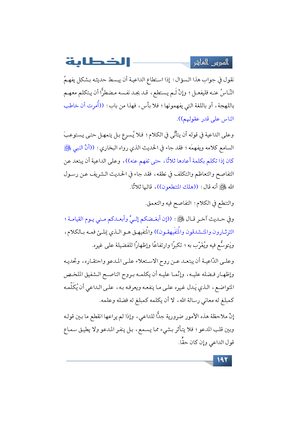 وعلى الداعية في قوله أن يتأنَّى في الكلام؛ فلا يُسرع بل يتمهل حتى يستوعبَ السامع كلامه ويفهمَه؛ فقد جاء في الحديث الذي رواه البخاري: ((أنّ النبي -صلى الله عليه وسلم- كان إذا تكلم بكلمة أعادها ثلاثًا، حتى تفهم عنه)). وعلى الداعية أن يبتعد عن التفاصح والتعاظم والتكلف في نطقه، فقد جاء في الحديث الشريف عن رسول الله -صلى الله عليه وسلم- أنه قال: ((هلك المتنطعون)) قالها ثلاثًا. والتنطع في الكلام التفاصح فيه والتعمق.