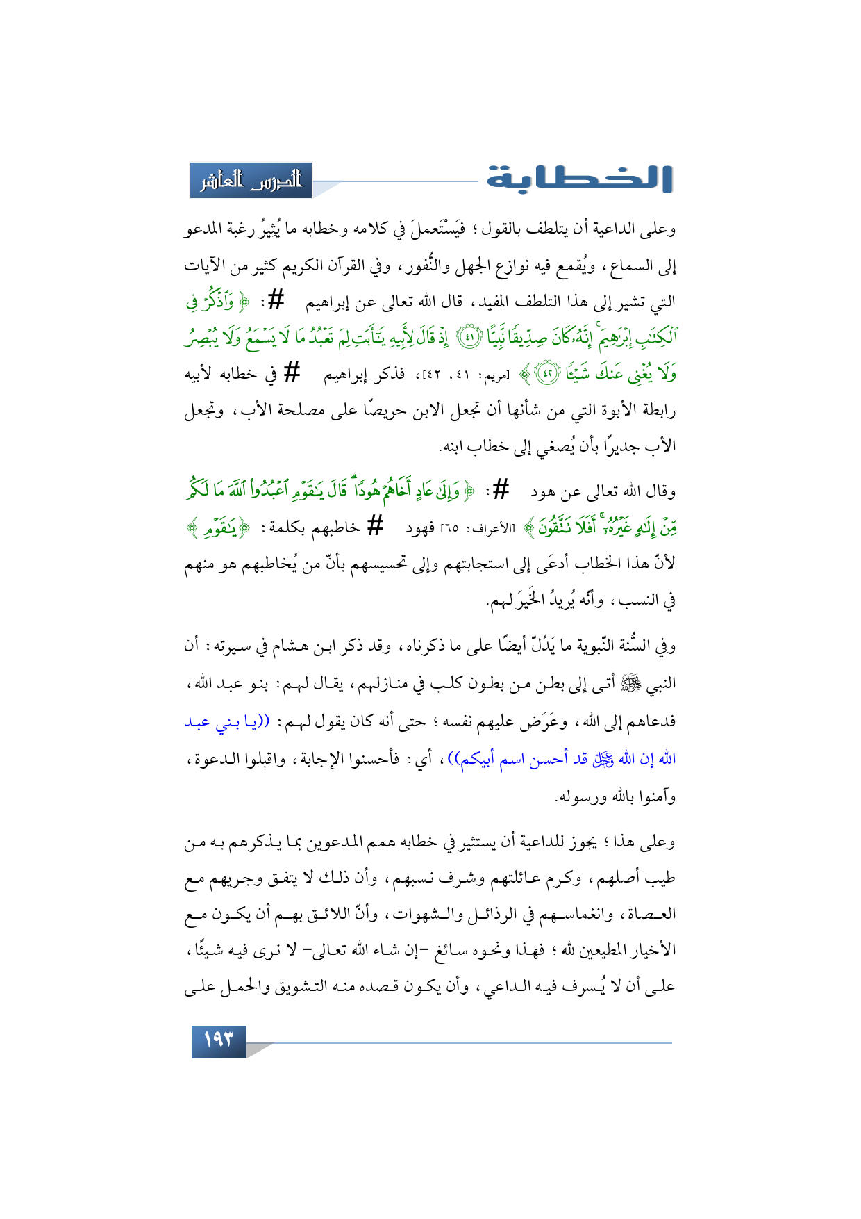 وقال الله تعالى عن هود -عليه السلام-: {وَإِلَى عَادٍ أَخَاهُمْ هُودًا قَالَ يَا قَوْم اعْبُدُوا اللَّهَ مَا لَكُمْ مِنْ إِلَهٍ غَيْرُهُ أَفَلَا تَتَّقُونَ} (الأعراف: 65) فهود -عليه السلام- خاطبهم بكلمة: {يَا قَوْم} لأنّ هذا الخطاب أدعَى إلى استجابتهم وإلى تحسيسهم بأنّ من يُخاطبهم هو منهم في النسب، وأنّه يُريدُ الخَيرَ لهم.