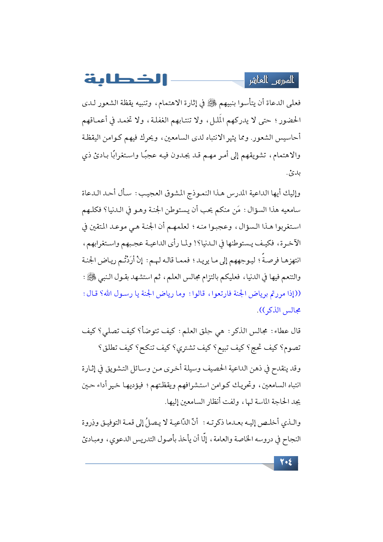 وإليك أيها الداعية المدرس هذا النموذج المشوق العجيب: سأل أحد الدعاة سامعيه هذا السؤال: مَن منكم يحب أن يستوطن الجنة وهو في الدنيا؟ فكلهم استغربوا هذا السؤال، وعجبوا منه لعلمهم أن الجنة هي موعد المتقين في الآخرة، فكيف يستوطنها في الدنيا؟! ولما رأى الداعية عجبهم واستغرابهم، انتهزها فرصةً؛ ليوجههم إلى ما يريد؛ فمما قاله لهم: إنْ أرَدْتُم رياض الجنة والتنعم فيها في الدنيا، فعليكم بالتزام مجالس العلم، ثم استشهد بقول النبي -صلى الله عليه وسلم-: ((إذا مررتم برياض الجنة فارتعوا، قالوا: وما رياض الجنة يا رسول الله؟ قال: مجالس الذكر)).