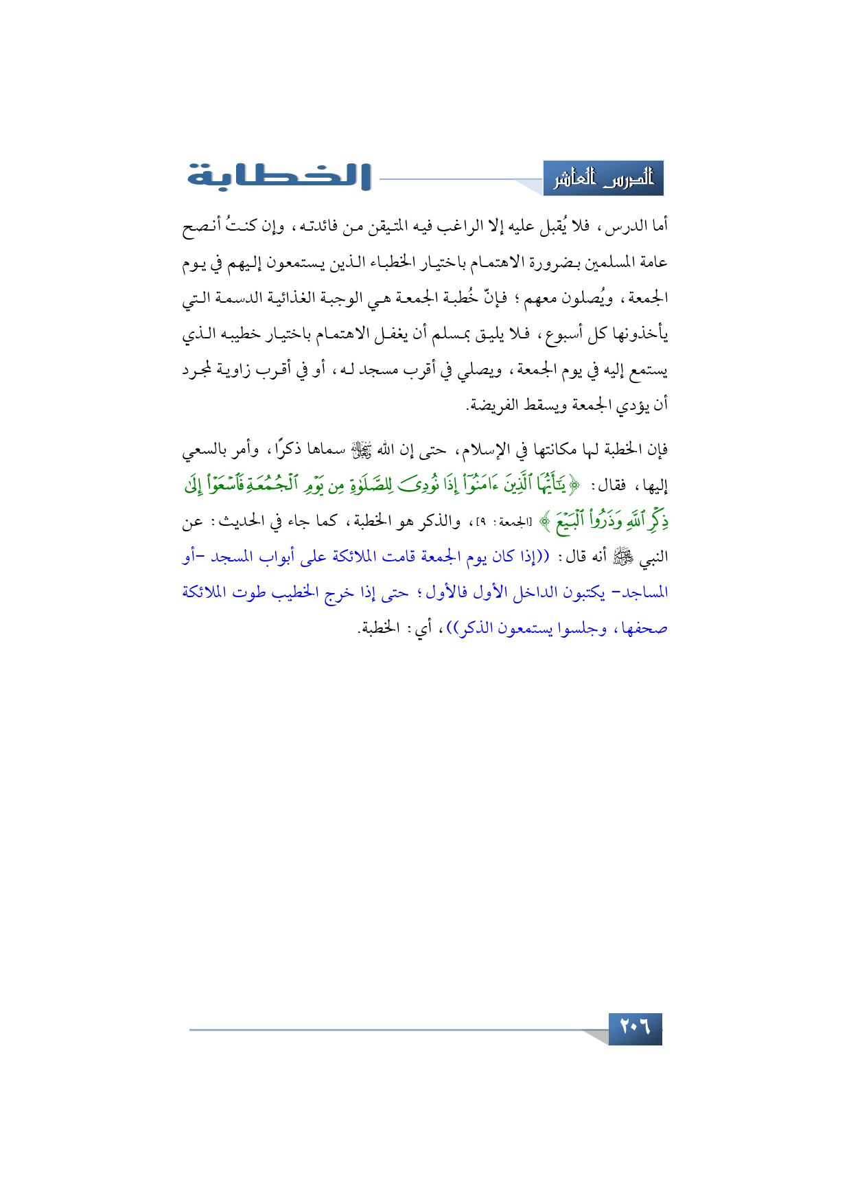 أما الدرس فلا يُقبل عليه إلا الراغب فيه المتيقن من فائدته، وإن كنتُ أنصح عامة المسلمين بضرورة الاهتمام باختيار الخطباء الذين يستمعون إليهم في يوم الجمعة، ويُصلون معهم؛ فإنّ خُطبة الجمعة هي الوجبة الغذائية الدسمة التي يأخذونها كل أسبوع، فلا يليق بمسلم أن يغفل الاهتمام باختيار خطيبه الذي يستمع إليه في يوم الجمعة، ويصلي في أقرب مسجد له أو في أقرب زاوية لمجرد أن يؤدي الجمعة ويسقط الفريضة.