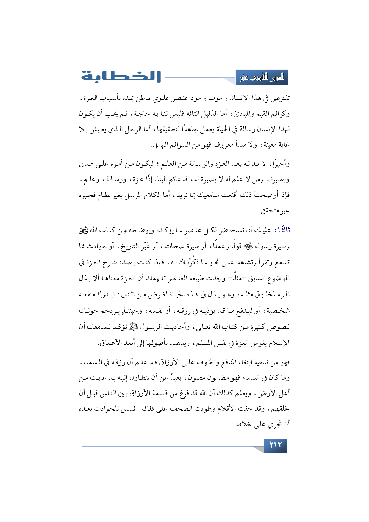 ثالثًا: عليك أن تستحضر لكل عنصر ما يؤكده ويوضحه مِن كتاب الله -عز وجل- وسيرة رسوله -صلى الله عليه وسلم- قولًا وعملًا، أو سيرة صحابته، أو عَبْر التاريخ، أو حوادث مما تسمع وتقرأ وتشاهد على نحو ما ذكرناك به. فإذا كنت بصدد شرح العزة في الموضوع السابق -مثلًا- وجدت طبيعة العنصر تلهمك أن العزة معناها ألا يذل المرء لمخلوق مثله، وهو يذل في هذه الحياة لغرض من اثنين: ليدرك منفعة شخصية أو ليدفع ما قد يؤذيه في رزقه أو نفسه، وحينئذٍ يزدحم حولك نصوص كثيرة من كتاب الله تعالى وأحاديث الرسول -صلى الله عليه وسلم- تؤكد لسامعك أن الإسلام يغرس العزة في نفس المسلم، ويذهب بأصولها إلى أبعد الأعما.
