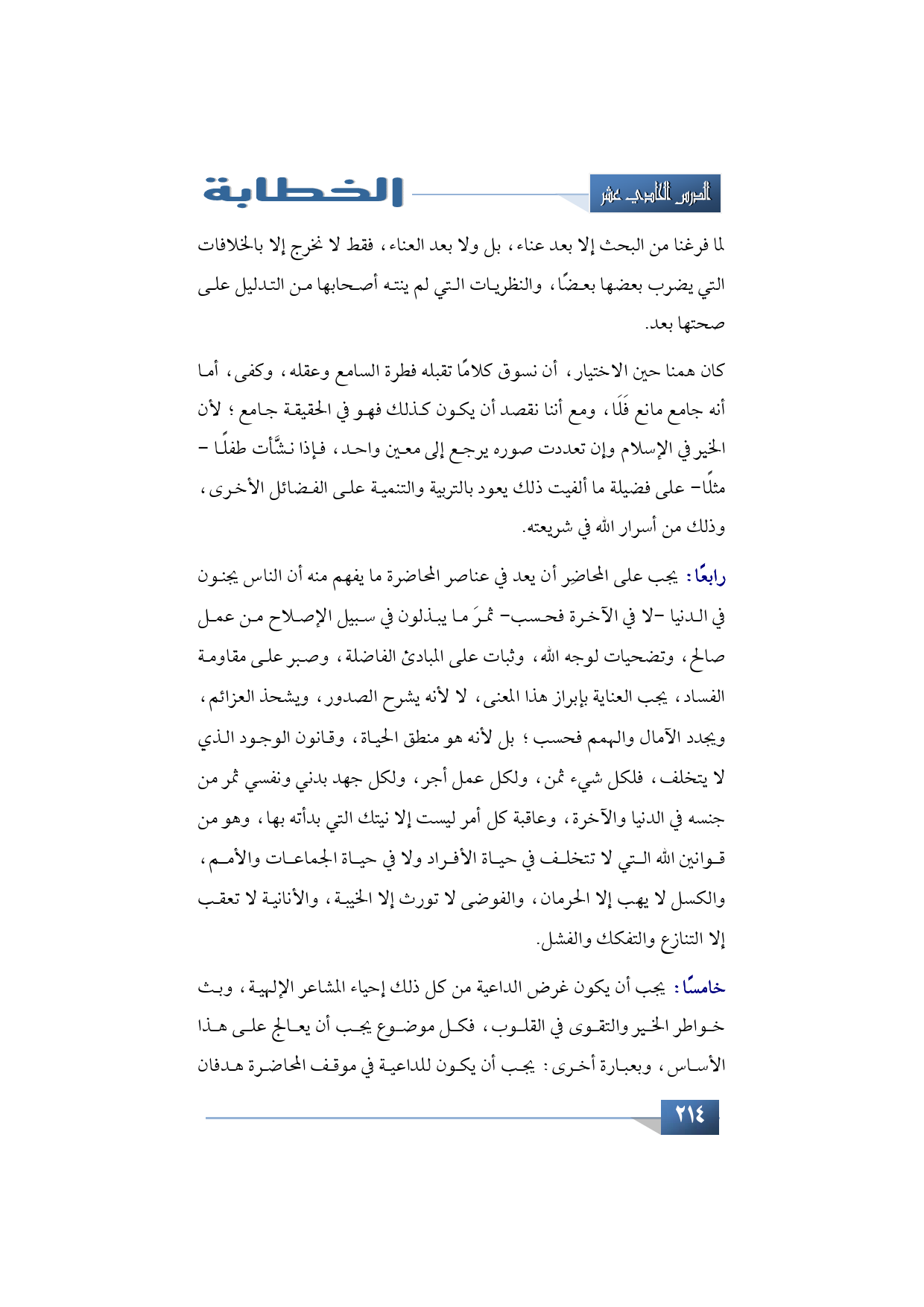 خامسًا: يجب أن يكون غرض الداعية من كل ذلك إحياء المشاعر الإلهية، وبث خواطر الخير والتقوى في القلوب، فكل موضوع يجب أن يعالج على هذا الأساس، وبعبارة أخرى: يجب أن يكون للداعية في موقف المحاضرة هدفان