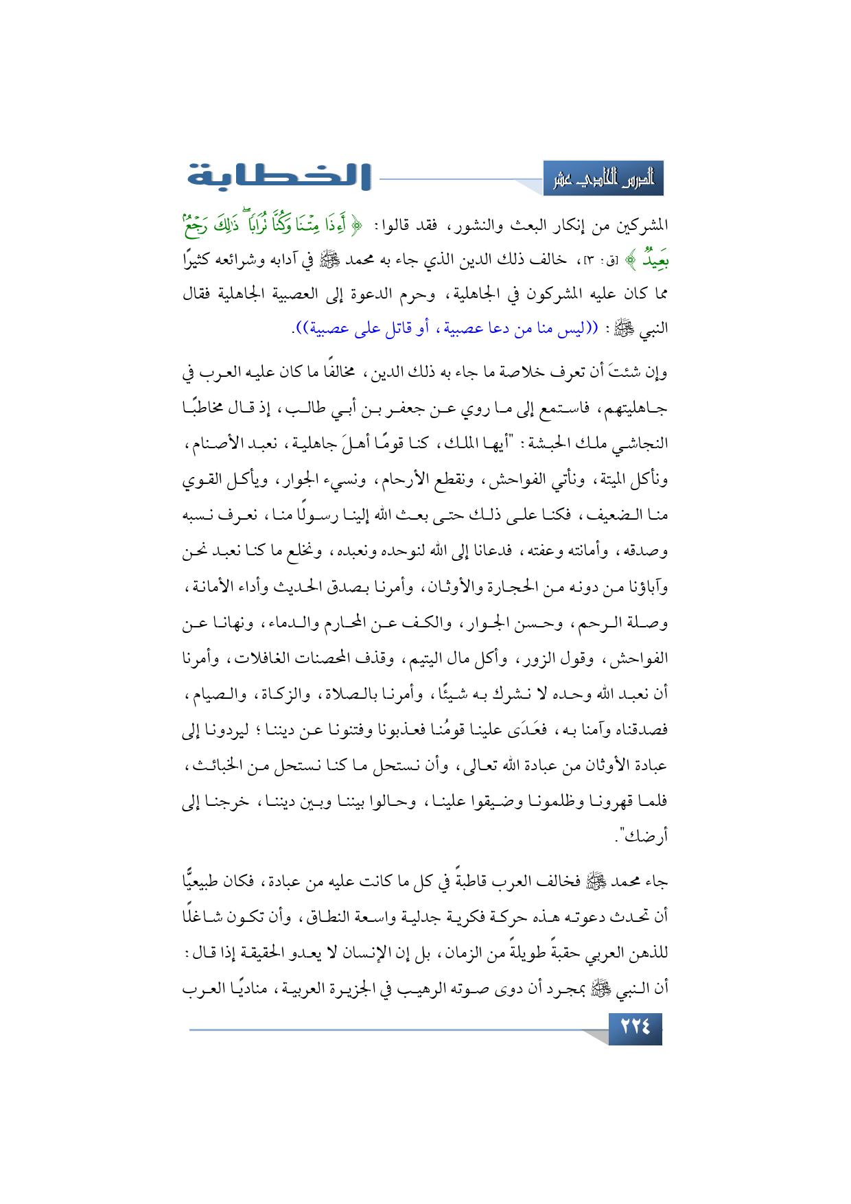 المشركين من إنكار البعث والنشور، فقد قالوا: {أَئِذَا مِتْنَا وَكُنَّا تُرَابًا ذَلِكَ رَجْعٌ بَعِيدٌ} (ق: 3) خالف ذلك الدين الذي جاء به محمد -صلى الله عليه وسلم- في آدابه وشرائعه كثيرًا مما كان عليه المشركون في الجاهلية، وحرم الدعوة إلى العصبية الجاهلية فقال النبي -صلى الله عليه وسلم-: ((ليس منا من دعا عصبية، أو قاتل على عصبية)).