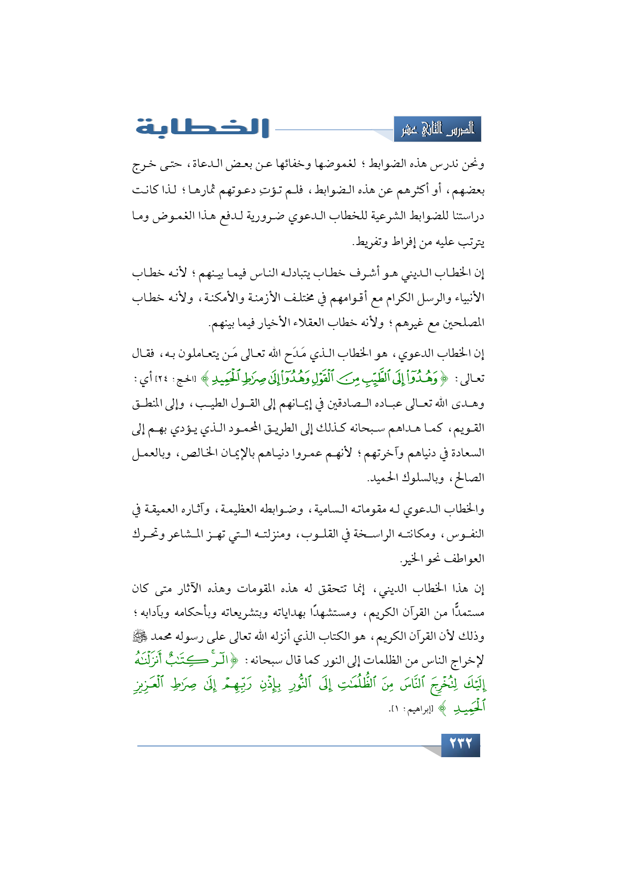 والخطاب الدعوي له مقوماته السامية وضوابطه العظيمة وآثاره العميقة في النفوس، ومكانته الراسخة في القلوب، ومنزلته التي تهز المشاعر وتحرك العواطف نحو الخير. إن هذا الخطاب الديني إنما تتحقق له هذه المقومات وهذه الآثار متى كان مستمدًّا من القرآن الكريم ومستشهدًا بهداياته وبتشريعاته وبأحكامه وبآدابه؛ وذلك لأن القرآن الكريم هو الكتاب الذي أنزله الله تعالى على رسوله محمد -صلى الله عليه وسلم- لإخراج الناس من الظلمات إلى النور كما قال سبحانه:} الر كِتَابٌ أَنْزَلْنَاهُ إِلَيْكَ لِتُخْرِجَ النَّاسَ مِنَ الظُّلُمَاتِ إِلَى النُّورِ بِإِذْنِ رَبِّهِمْ إِلَى صِرَاطِ الْعَزِيزِ الْحَمِيدِ {(إبراهيم: 1).