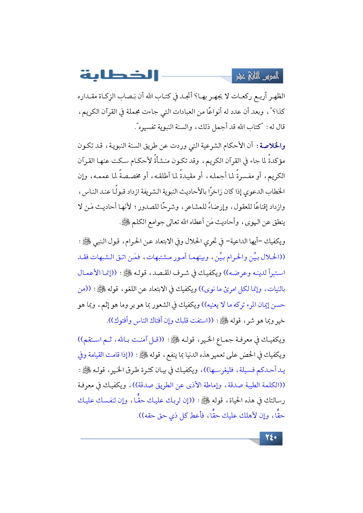 ويكفيك -أيها الداعية- في تحري الحلال وفي الابتعاد عن الحرام، قول النبي -صلى الله عليه وسلم-: ((الحلال بين والحرام بين، وبينهما أمور مشتبهات، فمَن اتق الشبهات فقد استبرأ لدينه وعرضه)) ويكفيك في شرف المقصد قوله -صلى الله عليه وسلم-: ((إنما الأعمال بالنيات، وإنما لكل امرئ ما نوى)) ويكفيك في الابتعاد عن اللغو قوله -صلى الله عليه وسلم-: ((من حسن إيمان المرء تركه ما لا يعنيه)) ويكفيك في الشعور بما هو بِر وما هو إثم وبما هو خير وبما هو شر قوله -صلى الله عليه وسلم-: ((استفت قلبك وإن أفتاك الناس وأفتوك)).