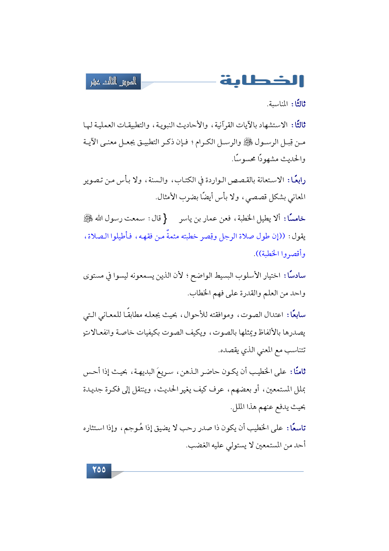 سادسًا: اختيار الأسلوب البسيط الواضح؛ لأن الذين يسمعونه ليسوا في مستوى واحد من العلم والقدرة على فهم الخطاب.