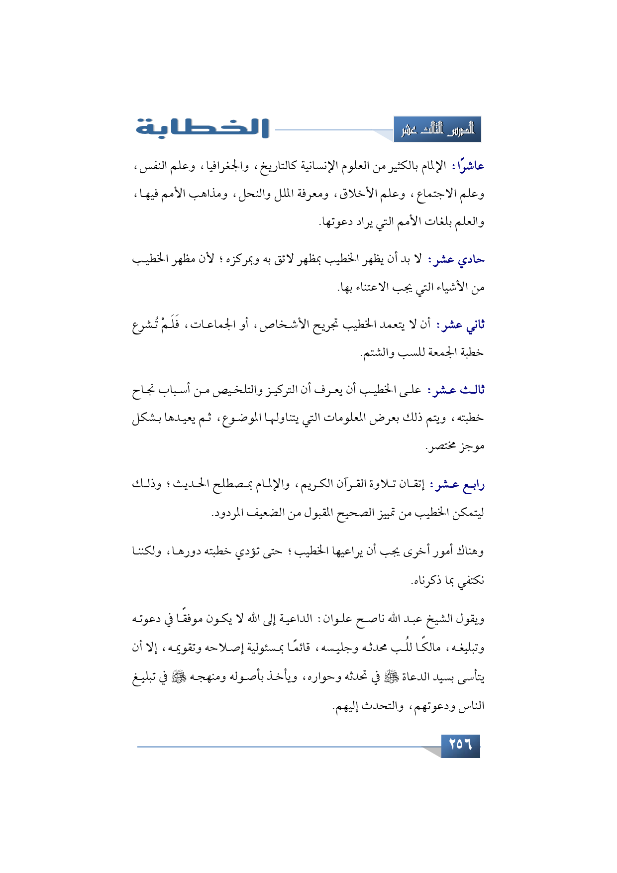 ثالث عشر: على الخطيب أن يعرف أن التركيز والتلخيص من أسباب نجاح خطبته، ويتم ذلك بعرض المعلومات التي يتناولها الموضوع، ثم يعيدها بشكل موجز مختصر.