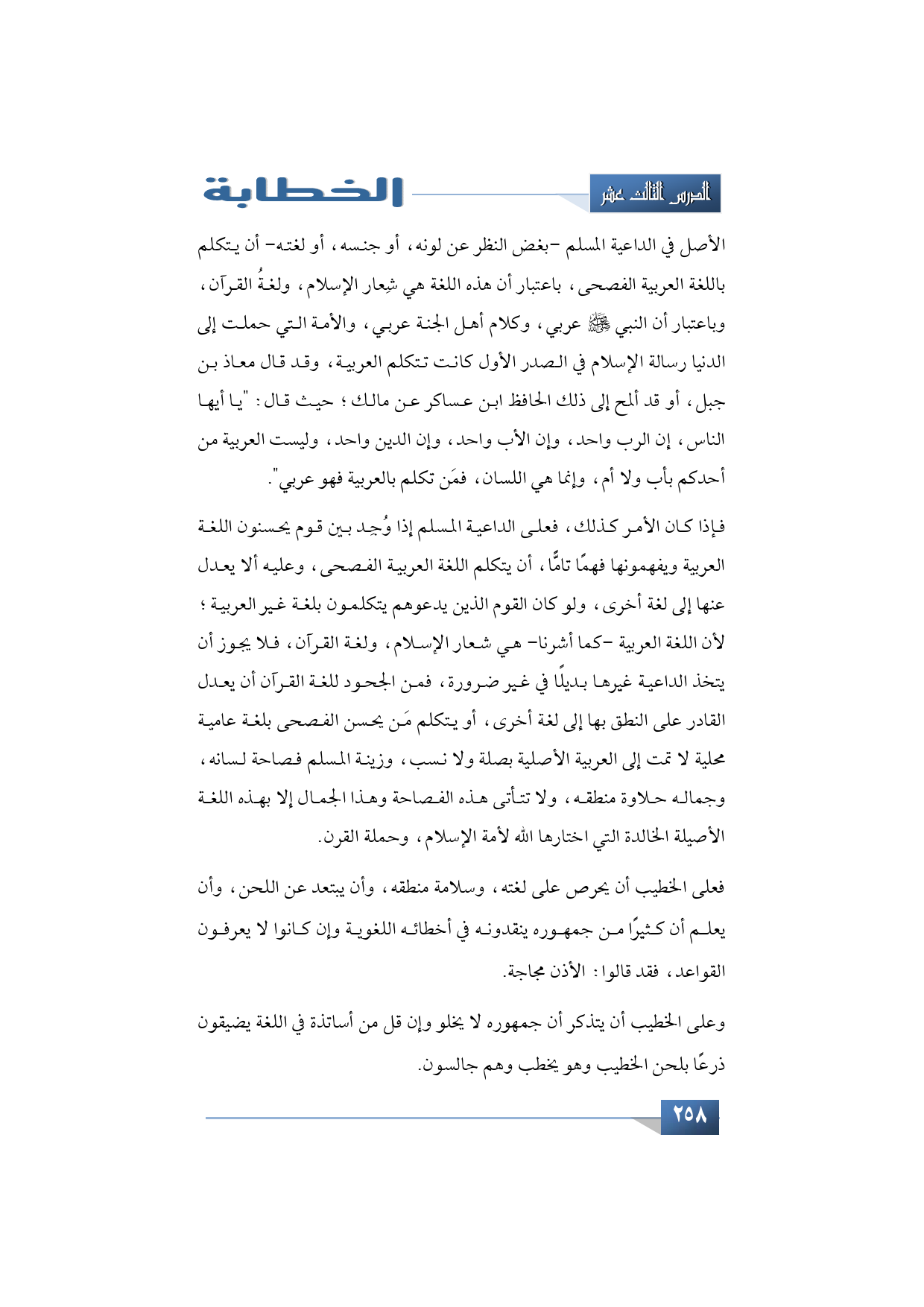 فإذا كان الأمر كذلك، فعلى الداعية المسلم إذا وُجِد بين قوم يحسنون اللغة العربية ويفهمونها فهمًا تامًّا، أن يتكلم اللغة العربية الفصحى، وعليه ألا يعدل عنها إلى لغة أخرى ولو كان القوم الذين يدعوهم يتكلمون بلغة غير العربية؛ لأن اللغة العربية -كما أشرنا- هي شعار الإسلام ولغة القرآن، فلا يجوز أن يتخذ الداعية غيرها بديلًا في غير ضرورة. فمن الجحود للغة القرآن أن يعدل القادر على النطق بها إلى لغة أخرى، أو يتكلم مَن يحسن الفصحى بلغة عامية محلية لا تمت إلى العربية الأصلية بصلة ولا نسب، وزينة المسلم فصاحة لسانه، وجماله حلاوة منطقه، ولا تتأتى هذه الفصاحة وهذا الجمال إلا بهذه اللغة الأصيلة الخالدة التي اختارها الله لأمة الإسلام، وحملة القرن.