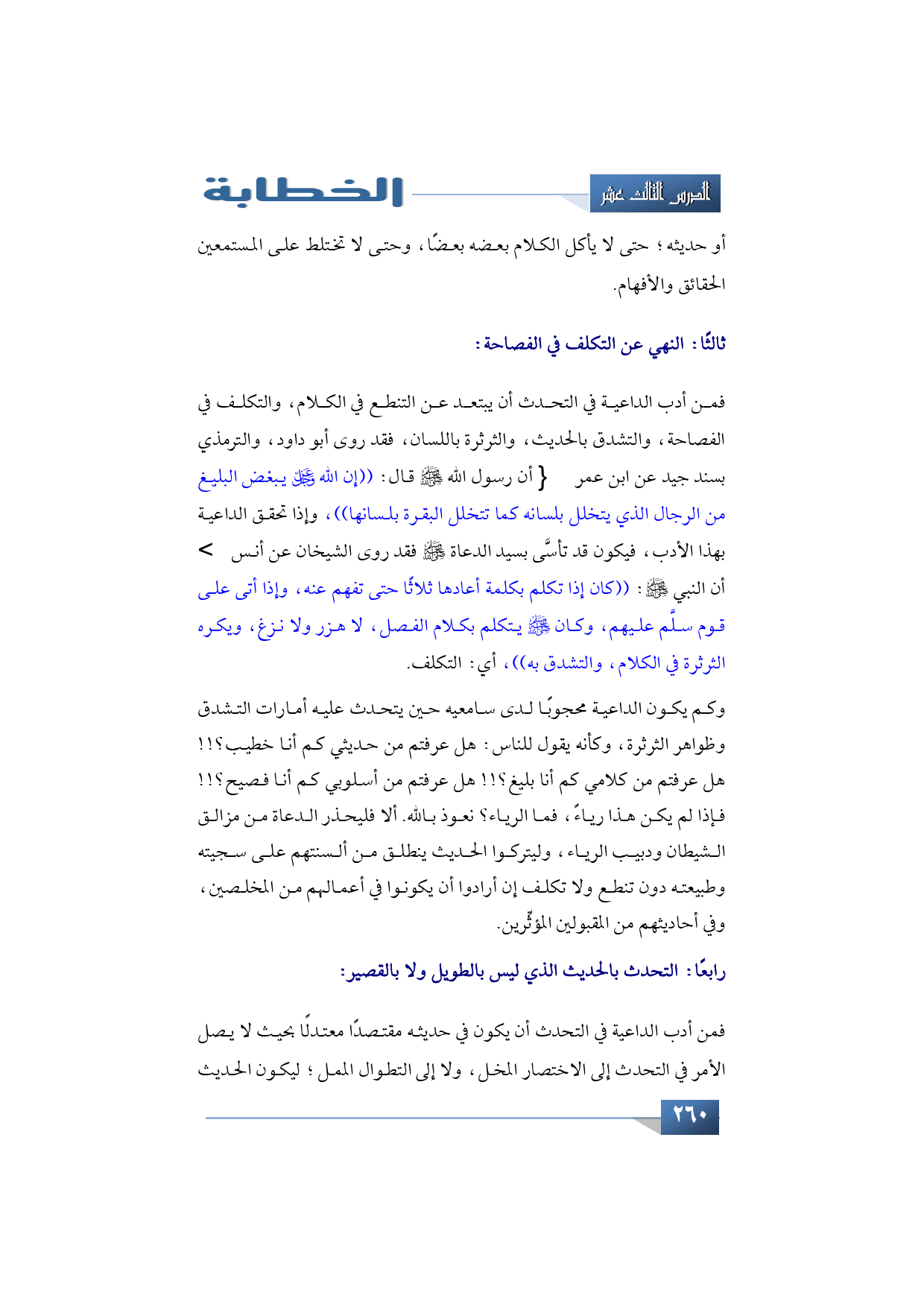 فمن أدب الداعية في التحدث أن يبتعد عن التنطع في الكلام، والتكلف في الفصاحة، والتشدق بالحديث، والثرثرة باللسان. فقد روى أبو داود والترمذي بسند جيد عن ابن عمر -رضي الله عنهما- أن رسول الله -صلى الله عليه وسلم- قال: ((إن الله -عز وجل- يبغض البليغ من الرجال الذي يتخلل بلسانه كما تتخلل البقرة بلسانها)) وإذا تحقق الداعية بهذا الأدب فيكون قد تأسَّى بسيد الدعاة -صلى الله عليه وسلم- فقد روى الشيخان عن أنس -رضي الله عنه- أن النبي -صلى الله عليه وسلم-: ((كان إذا تكلم بكلمة أعادها ثلاثًا حتى تفهم عنه، وإذا أتى على قوم سلَّم عليهم، وكان -صلى الله عليه وسلم- يتكلم بكلام الفصل، لا هزر ولا نزغ، ويكره الثرثرة في الكلام، والتشدق به)) أي: التكلف.