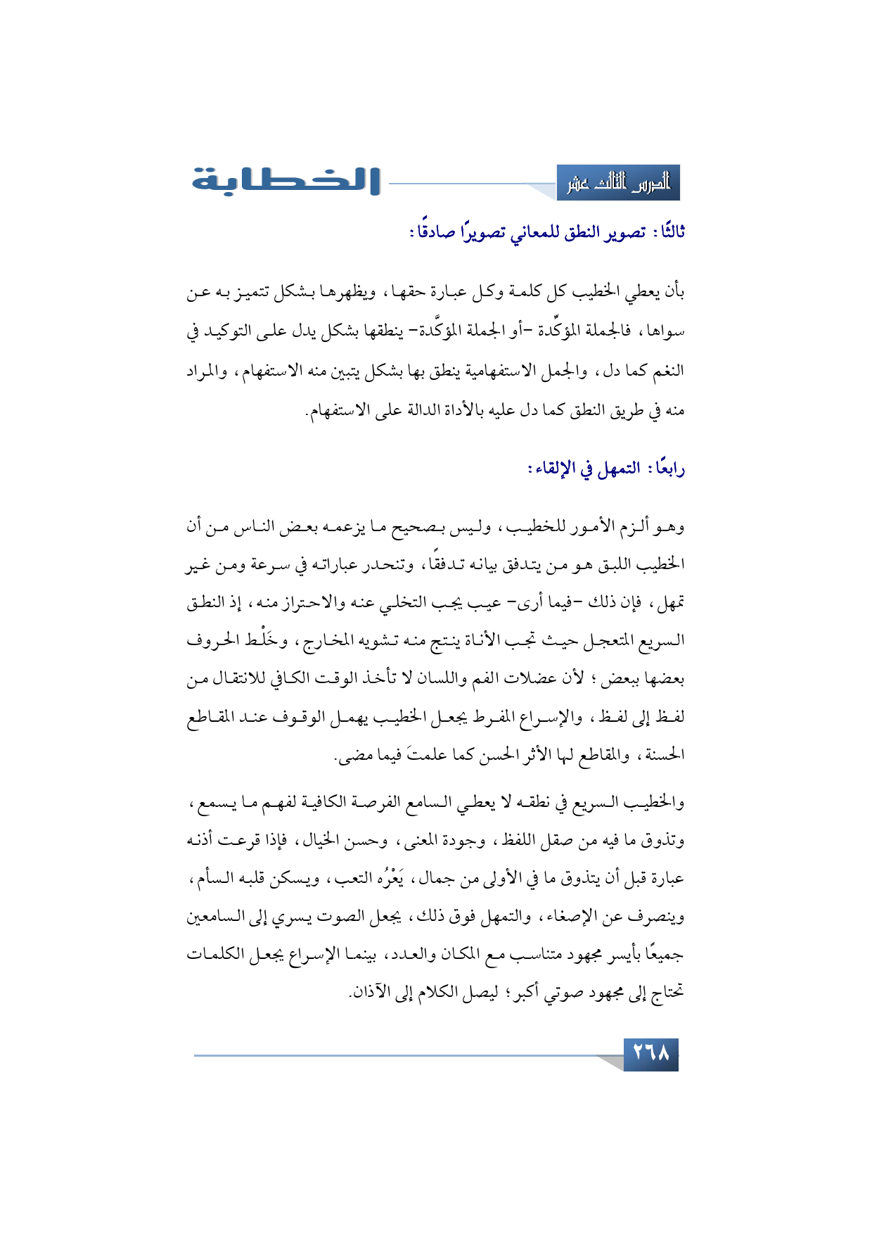 وهو ألزم الأمور للخطيب، وليس بصحيح ما يزعمه بعض الناس من أن الخطيب اللبق هو من يتدفق بيانه تدفقًا، وتنحدر عباراته في سرعة ومن غير تمهل، فإن ذلك -فيما أرى- عيب يجب التخلي عنه والاحتراز منه، إذ النطق السريع المتعجل حيث تجب الأناة ينتج منه تشويه المخارج، وخَلْط الحروف بعضها ببعض؛ لأن عضلات الفم واللسان لا تأخذ الوقت الكافي للانتقال من لفظ إلى لفظ، والإسراع المفرط يجعل الخطيب يهمل الوقوف عند المقاطع الحسنة، والمقاطع لها الأثر الحسن كما علمتَ فيما مضى.
