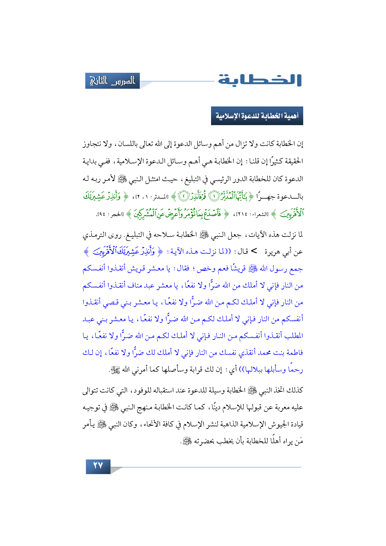 لما نزلت هذه الآيات جعل النبي -صلى الله عليه وسلم- الخطابة سلاحه في التبليغ. روى الترمذي عن أبي هريرة -رضي الله عنه- قال: ((لما نزلت هذه الآية: {وَأَنْذِرْ عَشِيرَتَكَ الْأَقْرَبِينَ} جمع رسول الله -صلى الله عليه وسلم- قريشًا فعم وخص؛ فقال: يا معشر قريش أنقذوا أنفسكم من النار فإني لا أملك من الله ضرًّا ولا نفعًا. يا معشر عبد مناف أنقذوا أنفسكم من النار فإني لا أملك لكم من الله ضرًّا ولا نفعًا. يا معشر بني قصي أنقذوا أنفسكم من النار فإني لا أملك لكم من الله ضرًّا ولا نفعًا. يا معشر بني عبد المطلب أنقذوا أنفسكم من النار فإني لا أملك لكم من الله ضرًّا ولا نفعًا. يا فاطمة بنت محمد أنقذي نفسك من النار فإني لا أملك لك ضرًّا ولا نفعًا، إن لك رحما وسأبلها ببلالها)) أي: إن لك قرابة وسأصلها كما أمرني الله سبحانه وتعالى.