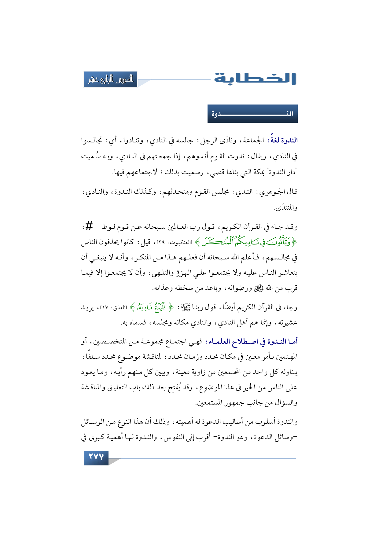 وجاء في القرآن الكريم أيضًا قول ربنا -سبحانه وتعالى-:} فَلْيَدْعُ نَادِيَهُ {(العلق: 17) يريد عشيرته، وإنما هم أهل النادي، والنادي مكانه ومجلسه، فسماه به.