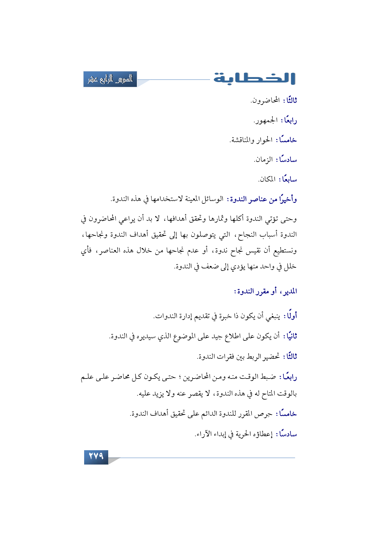 رابعًا: ضبط الوقت منه ومن المحاضرين؛ حتى يكون كل محاضر على علم بالوقت المتاح له في هذه الندوة، لا يقصر عنه ولا يزيد عليه.