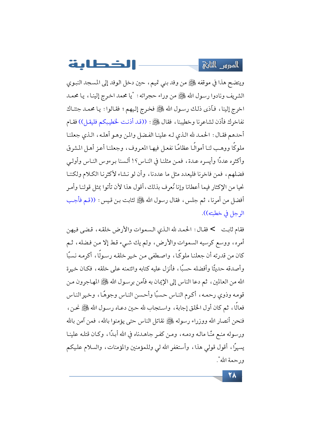 فقام ثابت -رضي الله عنه- فقال: الحمد لله الذي السموات والأرض خلقه، قضى فيهن أمره، ووسع كرسيه السموات والأرض، ولم يك شيء قط إلا من فضله، ثم كان من قدرته أن جعلنا ملوكًا، واصطفى من خير خلقه رسولًا، أكرمه نسبًا وأصدقه حديثًا وأفضله حسبًا، فأنزل عليه كتابه وائتمنه على خلقه، فكان خيرة الله من العالمين. ثم دعا الناس إلى الإيمان به فآمن برسول الله -صلى الله عليه وسلم- المهاجرون من قومه وذوي رحمه، أكرم الناس حسبًا وأحسن الناس وجوهًا، وخير الناس فعالًا، ثم كان أول الخلق إجابة واستجاب لله حين دعاه رسول الله -صلى الله عليه وسلم- نحن، فنحن أنصار الله ووزراء رسوله -صلى الله عليه وسلم- نقاتل الناس حتى يؤمنوا بالله، فمن آمن بالله ورسوله منع منا ماله ودمه، ومن كفر جاهدناه في الله أبدًا، وكان قتله علينا يسيرًا. أقول قولي هذا وأستغفر الله لي وللمؤمنين والمؤمنات، والسلام عليكم ورحمة الله".