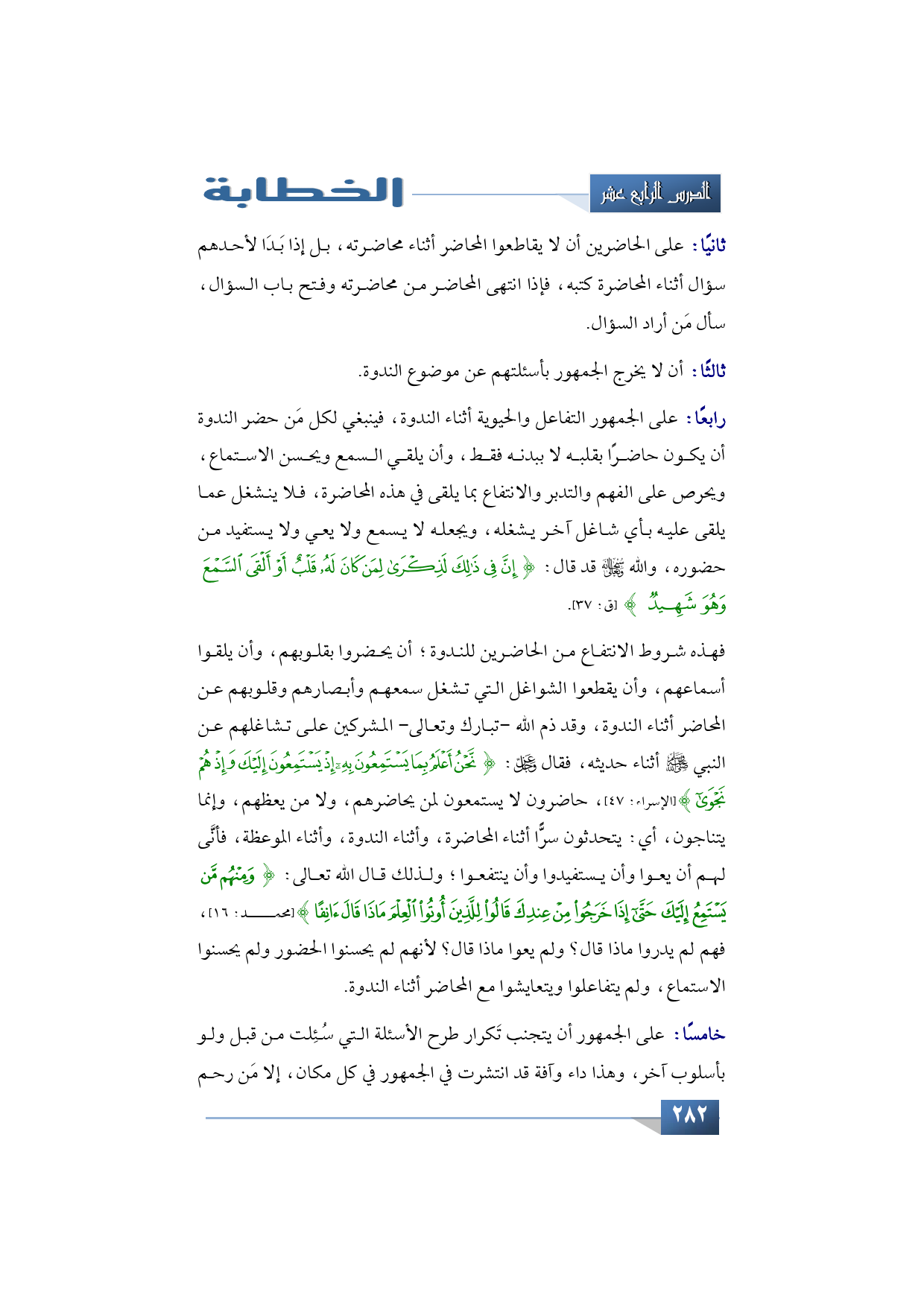 رابعًا: على الجمهور التفاعل والحيوية أثناء الندوة، فينبغي لكل مَن حضر الندوة أن يكون حاضرًا بقلبه لا ببدنه فقط، وأن يلقي السمع ويحسن الاستماع، ويحرص على الفهم والتدبر والانتفاع بما يلقى في هذه المحاضرة، فلا ينشغل عما يلقى عليه بأي شاغل آخر يشغله، ويجعله لا يسمع ولا يعي ولا يستفيد من حضوره، والله -سبحانه وتعالى- قد قال:} إِنَّ فِي ذَلِكَ لَذِكْرَى لِمَنْ كَانَ لَهُ قَلْبٌ أَوْ أَلْقَى السَّمْعَ وَهُوَ شَهِيدٌ {(ق: 37).