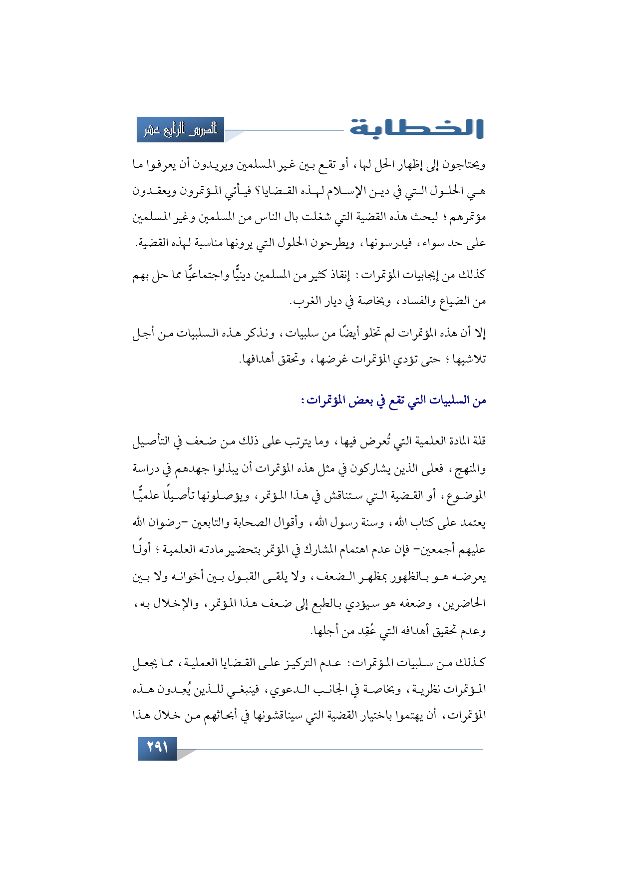 قلة المادة العلمية التي تُعرض فيها، وما يترتب على ذلك من ضعف في التأصيل والمنهج، فعلى الذين يشاركون في مثل هذه المؤتمرات أن يبذلوا جهدهم في دراسة الموضوع أو القضية التي ستناقش في هذا المؤتمر، ويؤصلونها تأصيلًا علميًّا يعتمد على كتاب الله، وسنة رسول الله، وأقوال الصحابة والتابعين -رضوان الله عليهم أجمعين- فإن عدم اهتمام المشارك في المؤتمر بتحضير مادته العلمية؛ أولًا يعرضه هو بالظهور بمظهر الضعف، ولا يلقى القبول بين أخوانه ولا بين الحاضرين، وضعفه هو سيؤدي بالطبع إلى ضعف هذا المؤتمر، والإخلال به، وعدم تحقيق أهدافه التي عُقِد من أجلها.
