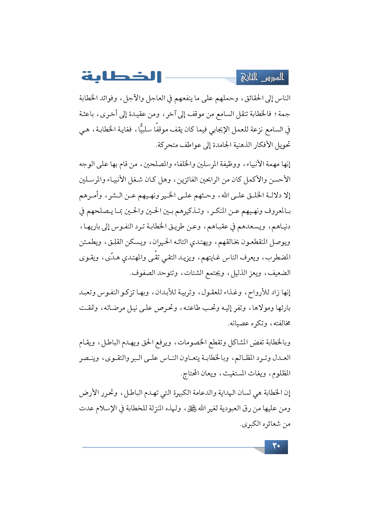 إنها زاد للأرواح وغذاء للعقول وتربية للأبدان، وبها تزكو النفوس وتعبد بارئها ومولاها، وتفر إليه وتحب طاعته، وتحرص على نيل مرضاته، وتمقت مخالفته، وتكره عصيانه. وبالخطابة تفض المشاكل وتقطع الخصومات، ويرفع الحق ويهدم الباطل، ويقام العدل وترد المظالم، وبالخطابة يتعاون الناس على البر والتقوى، وينصر المظلوم ويغاث المستغيث ويعان المحتاج.
