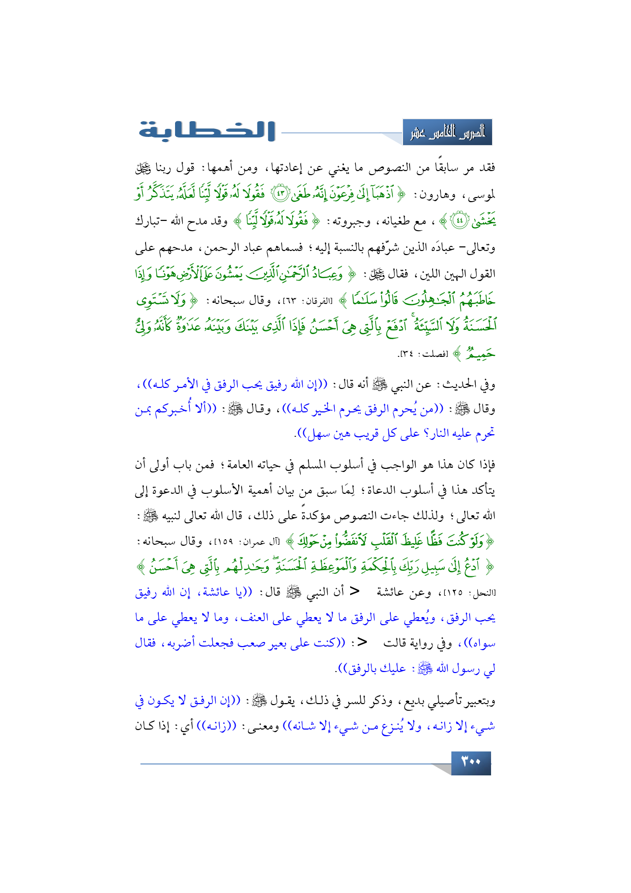 ولذلك جاءت النصوص مؤكدةً على ذلك قال الله تعالى لنبيه -صلى الله عليه وسلم-: {وَلَوْ كُنْتَ فَظًّا غَلِيظَ الْقَلْبِ لَانْفَضُّوا مِنْ حَوْلِكَ} (آل عمران: 159)، وقال سبحانه: {ادْعُ إِلَى سَبِيلِ رَبِّكَ بِالْحِكْمَةِ وَالْمَوْعِظَةِ الْحَسَنَةِ وَجَادِلْهُمْ بِالَّتِي هِيَ أَحْسَنُ} (النحل: 125)، وعن عائشة -رضي الله عنها- أن النبي -صلى الله عليه وسلم- قال: ((يا عائشة، إن الله رفيق يحب الرفق، ويُعطي على الرفق ما لا يعطي على العنف، وما لا يعطي على ما سواه)). وفي رواية قالت -رضي الله عنها-: ((كنت على بعير صعب فجعلت أضربه، فقال لي رسول الله -صلى الله عليه وسلم-: عليك بالرفق)).